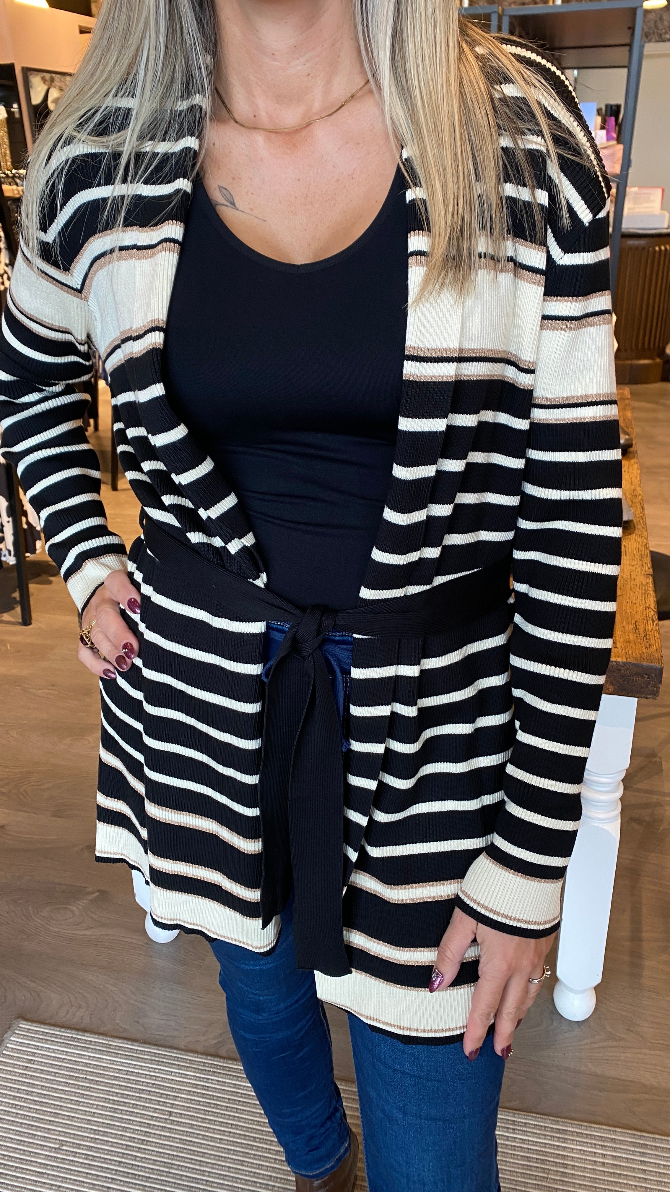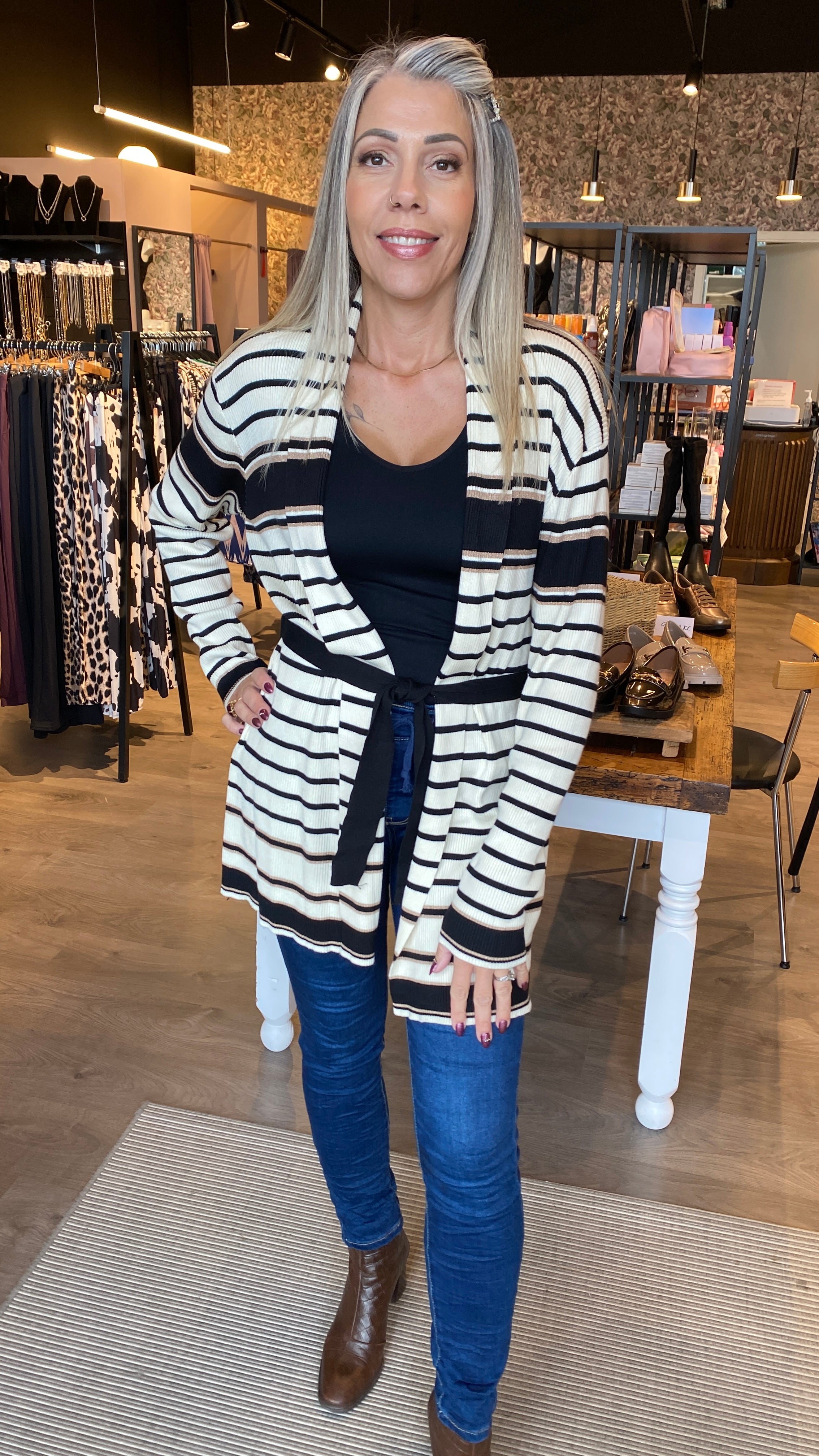 Falleg opin síða röndótt peysa með smá gylltu í og með bandi í mittinu.