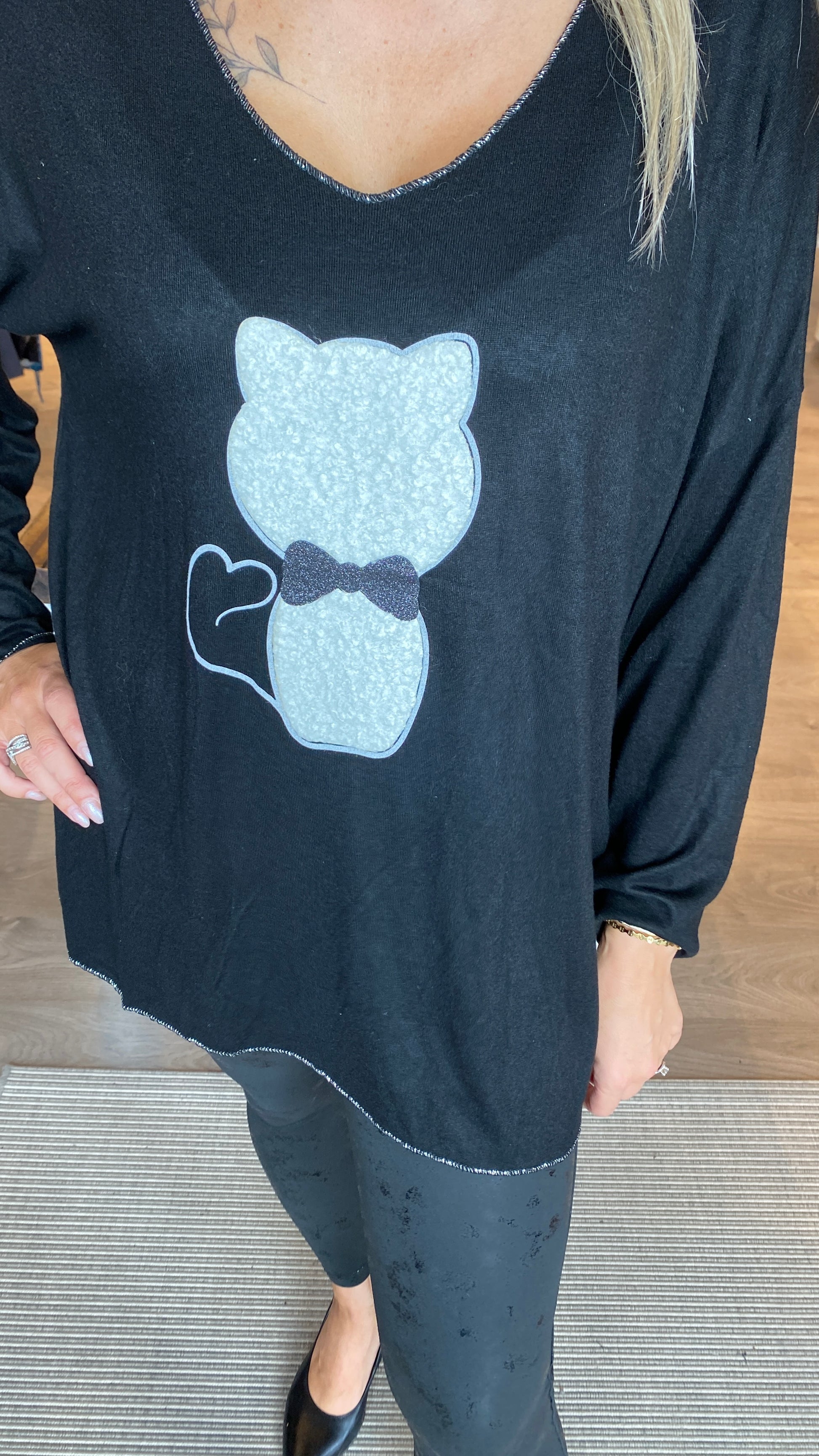 Svört peysa með hvítri kisu framan á V-hálsmál og slilfur þráðum í hálsmáli, ermum og að neðan.