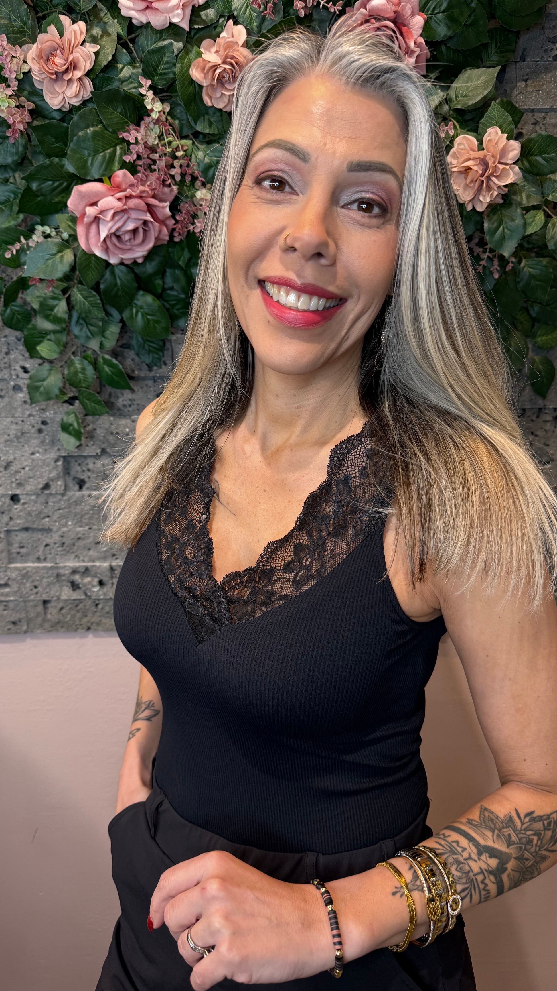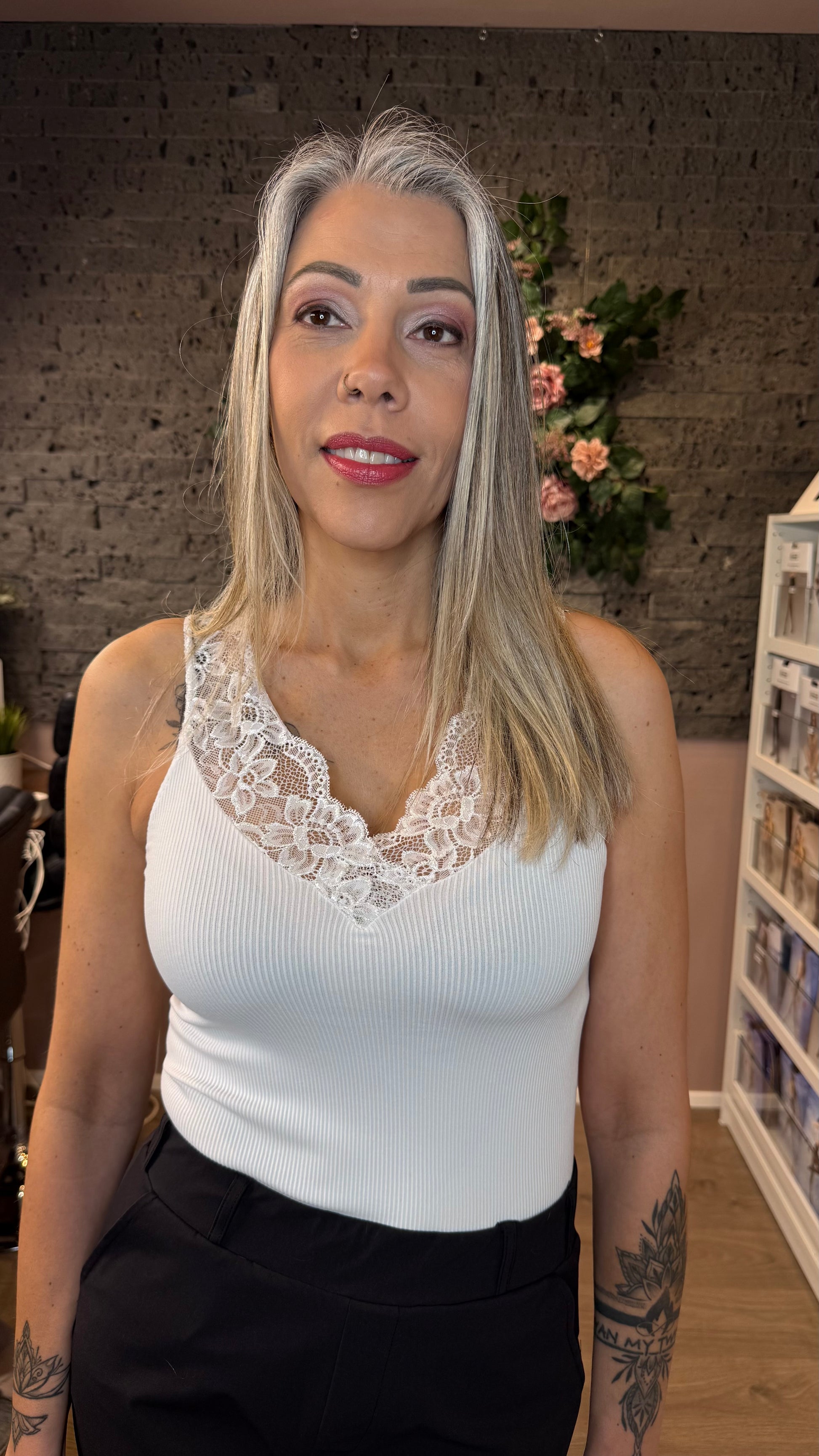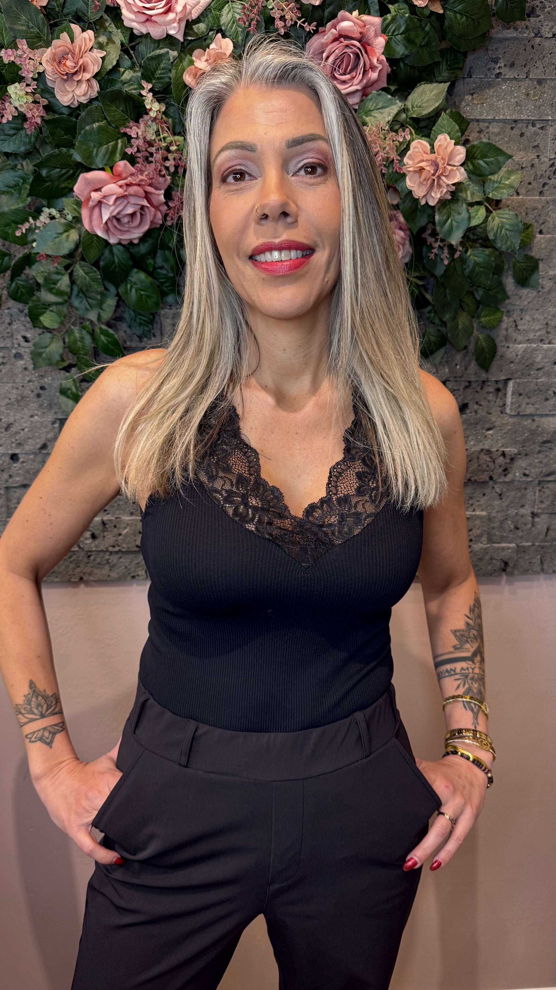 Geggjaður hlýrabolur V-hálsmál með blúndu úr gæða micro-fiber efni. Sérstaklega teygjanlegur og mjúkur viðkomu. Þessi er tilvalin viðbót við fataskápinn.
