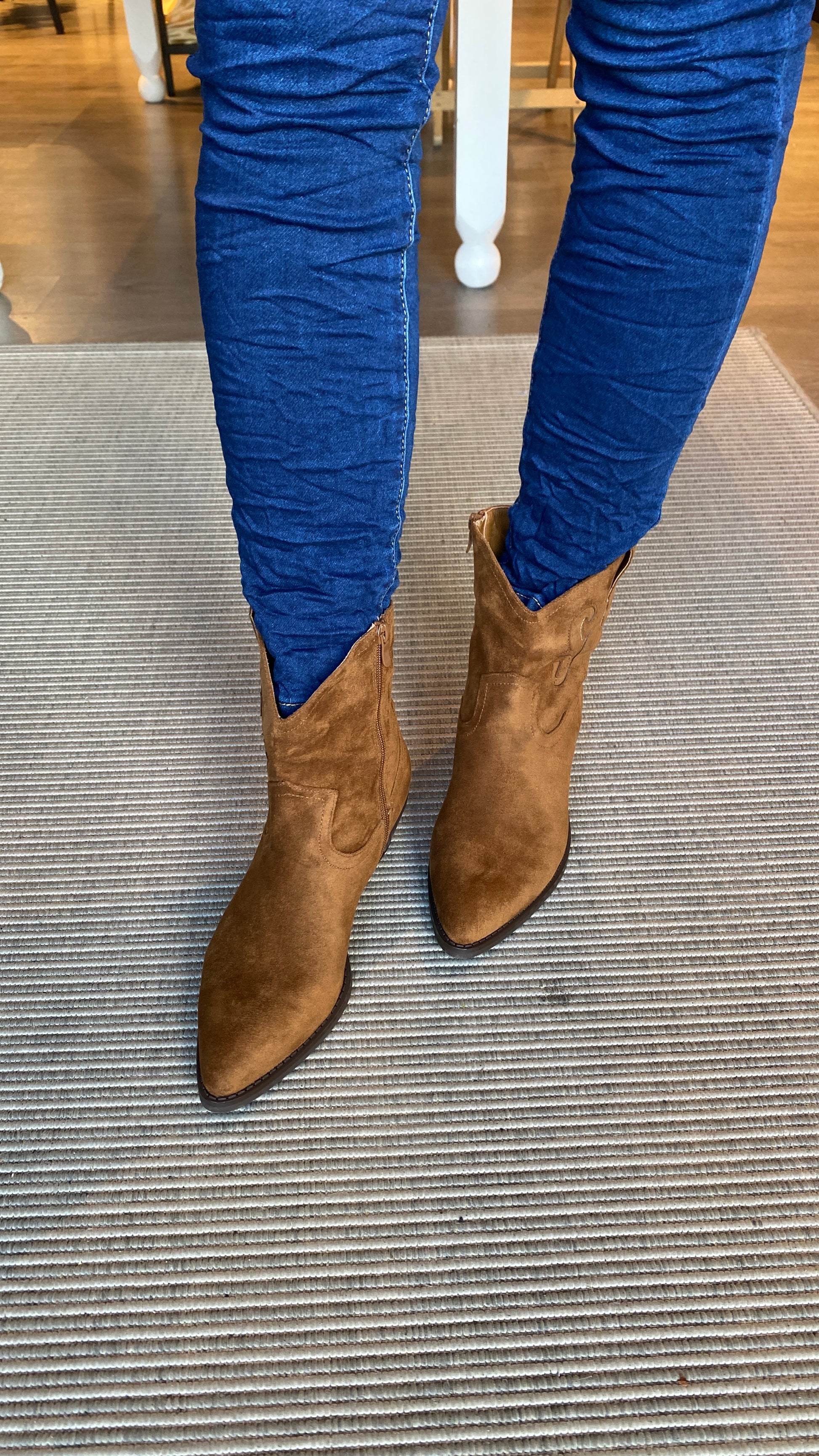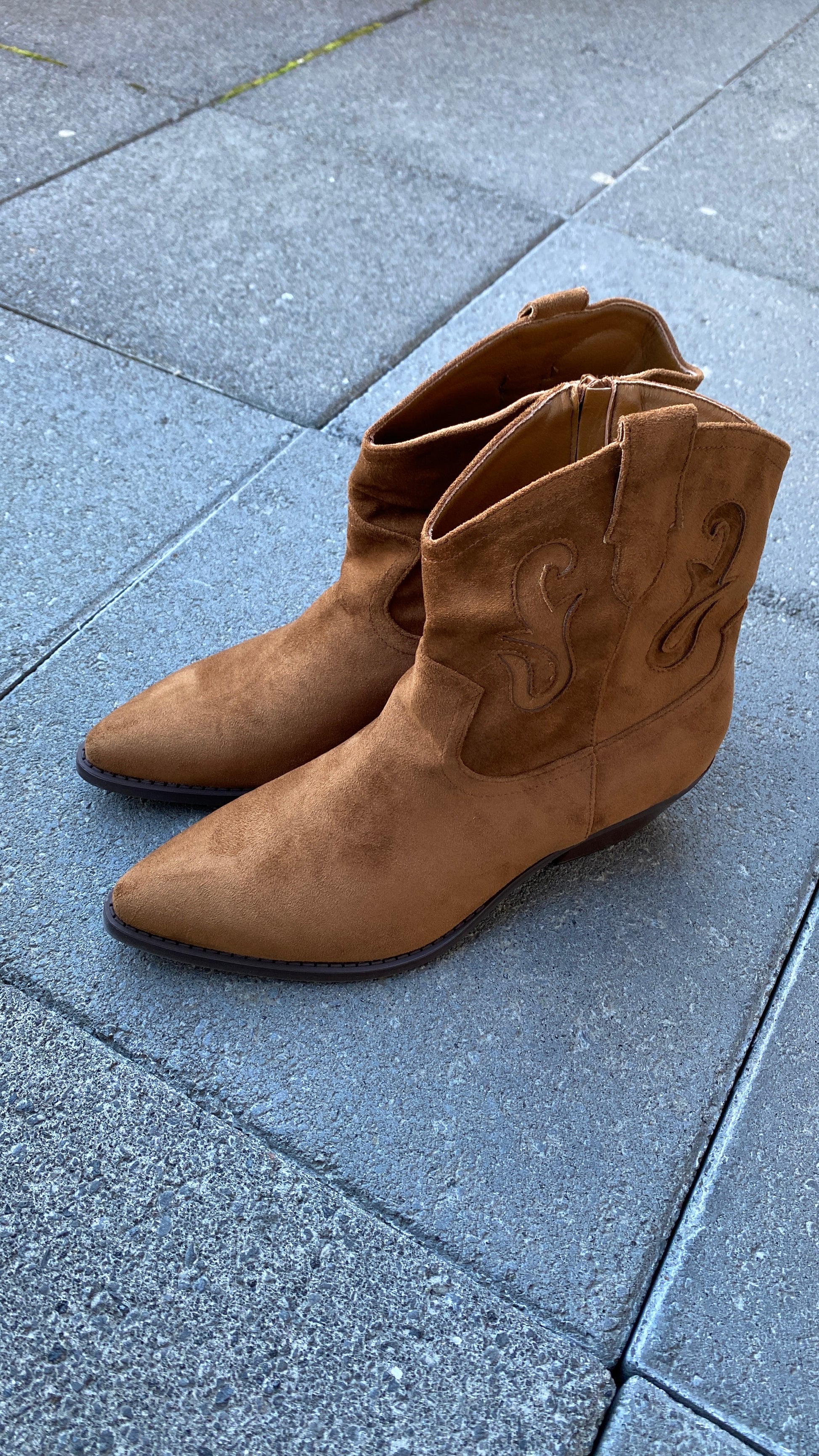 Fallegir Kamel litaðir kúrekaskór úr rúskinni með rennilás á hliðinni. Lágir hælar.