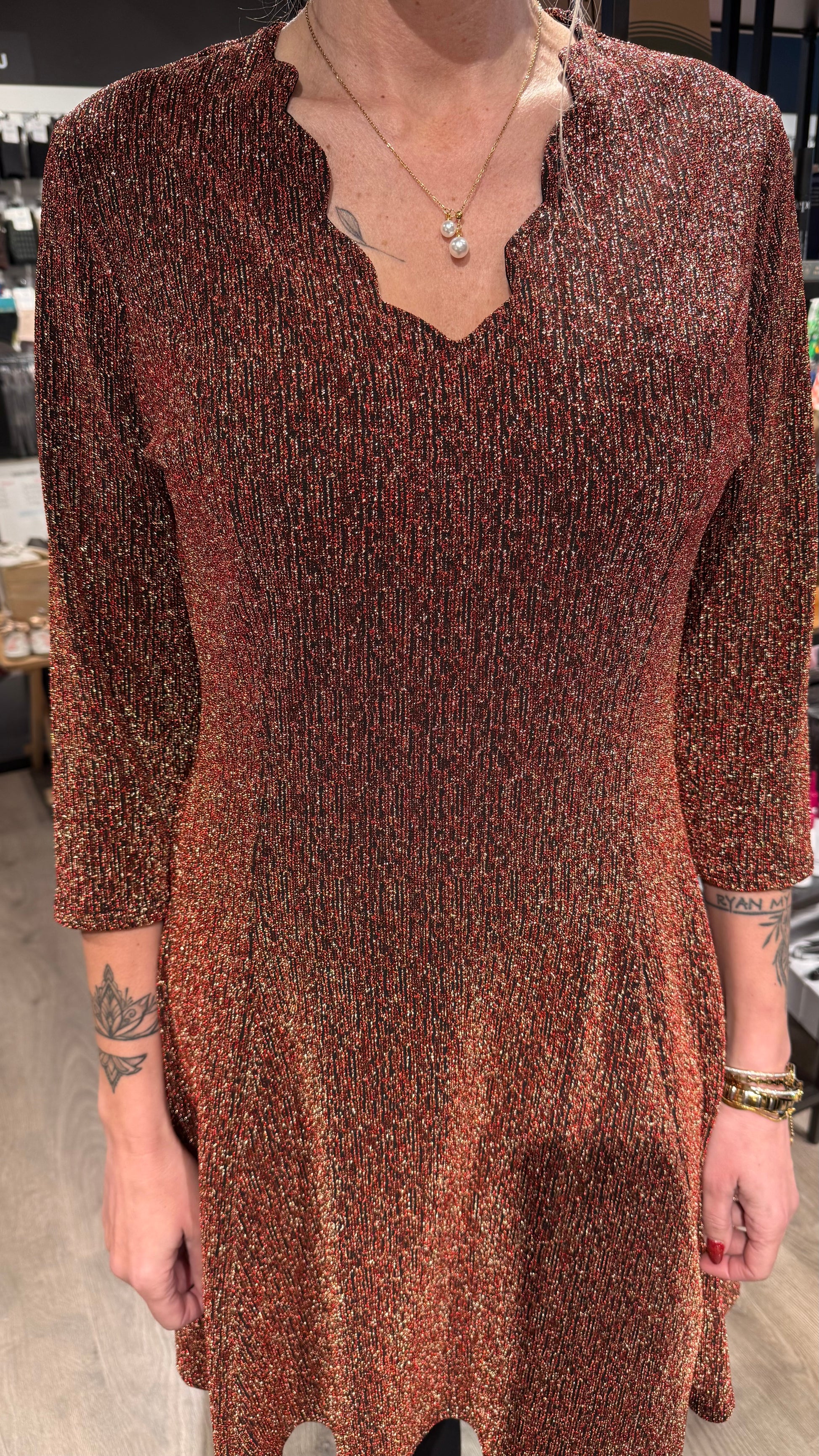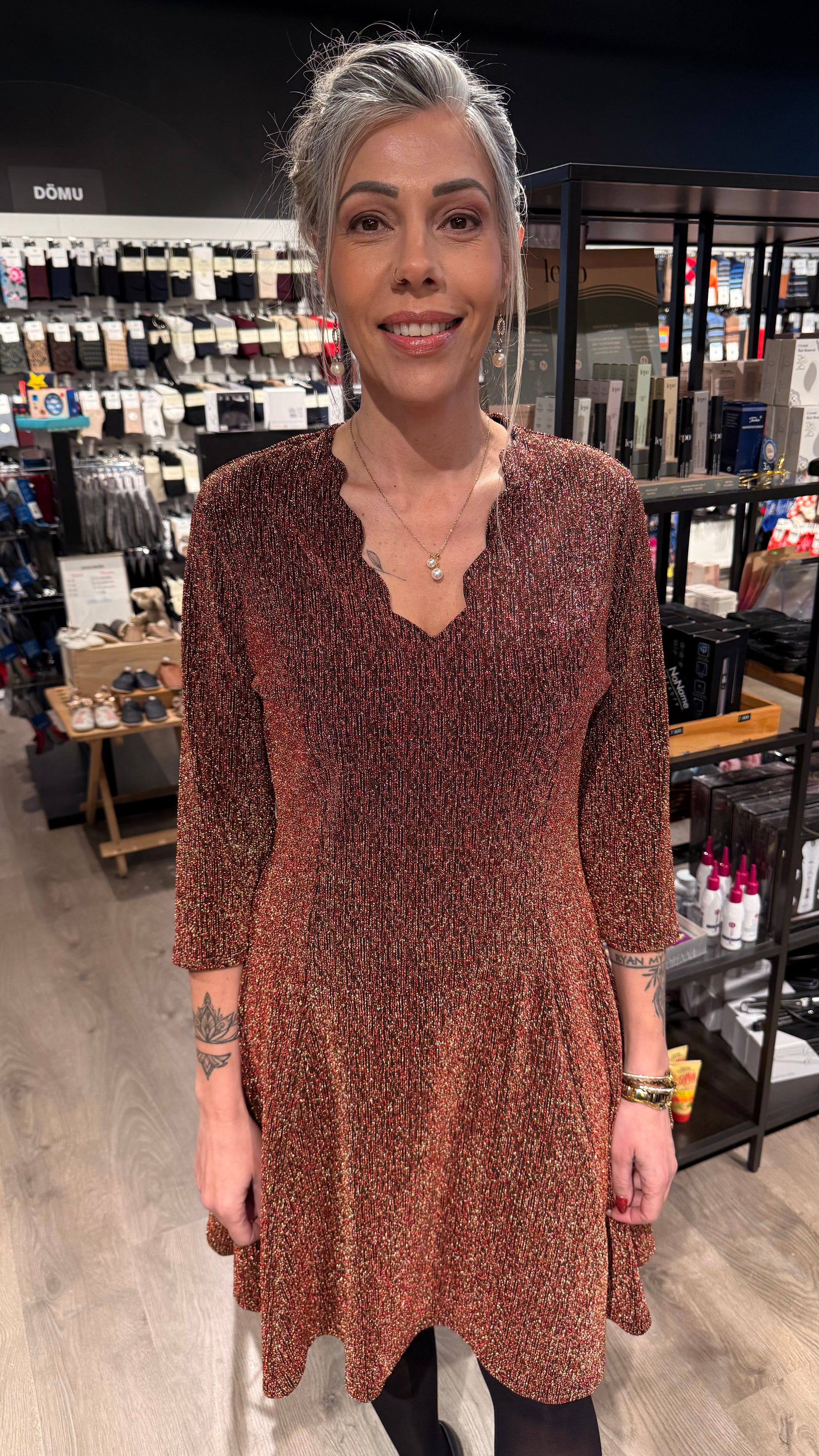 Sparilegur kjóll úr glansandi teygjanlegur efni. Kjóllinn er í A-sniði með fallegu V-hálsmáli