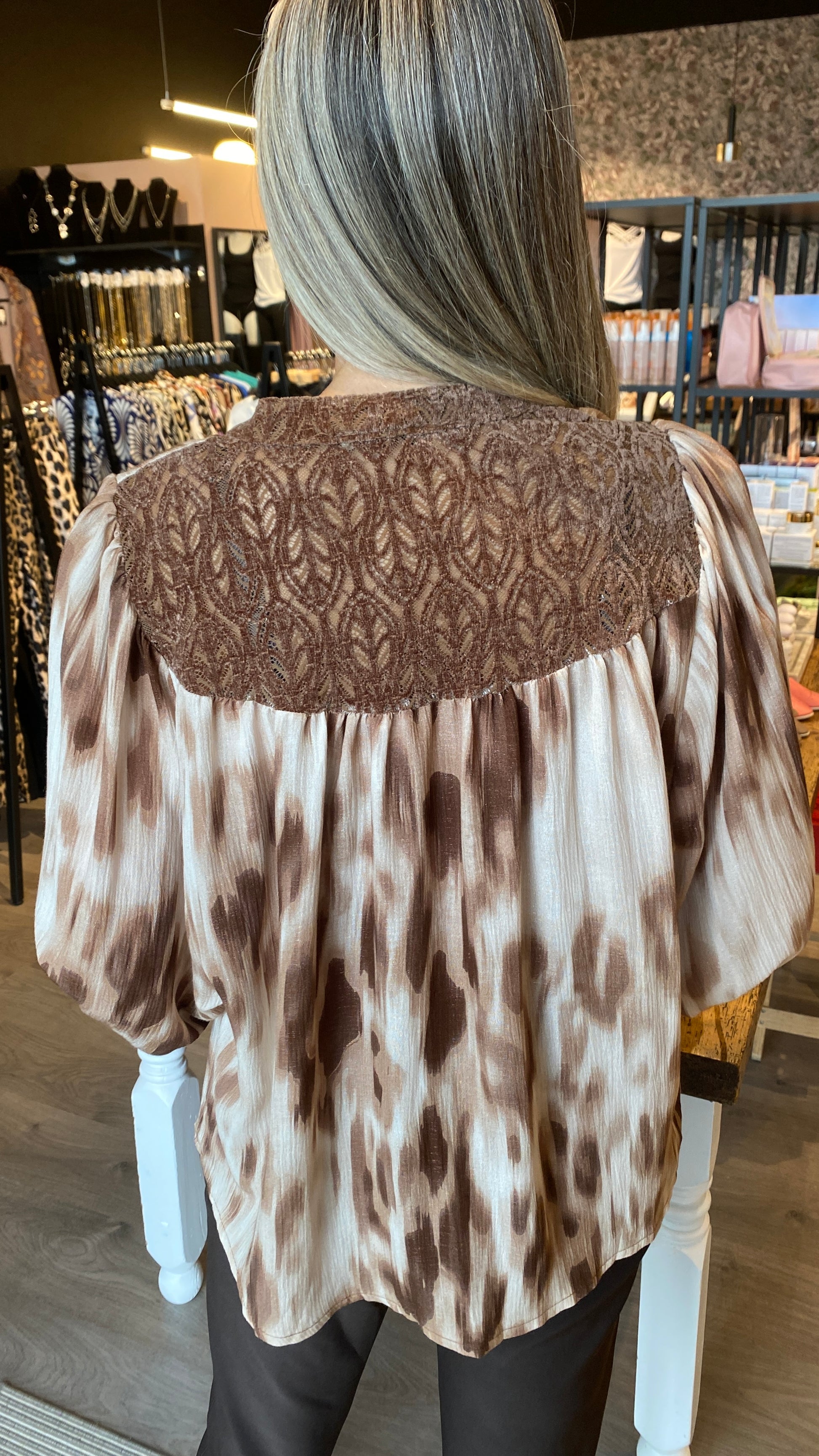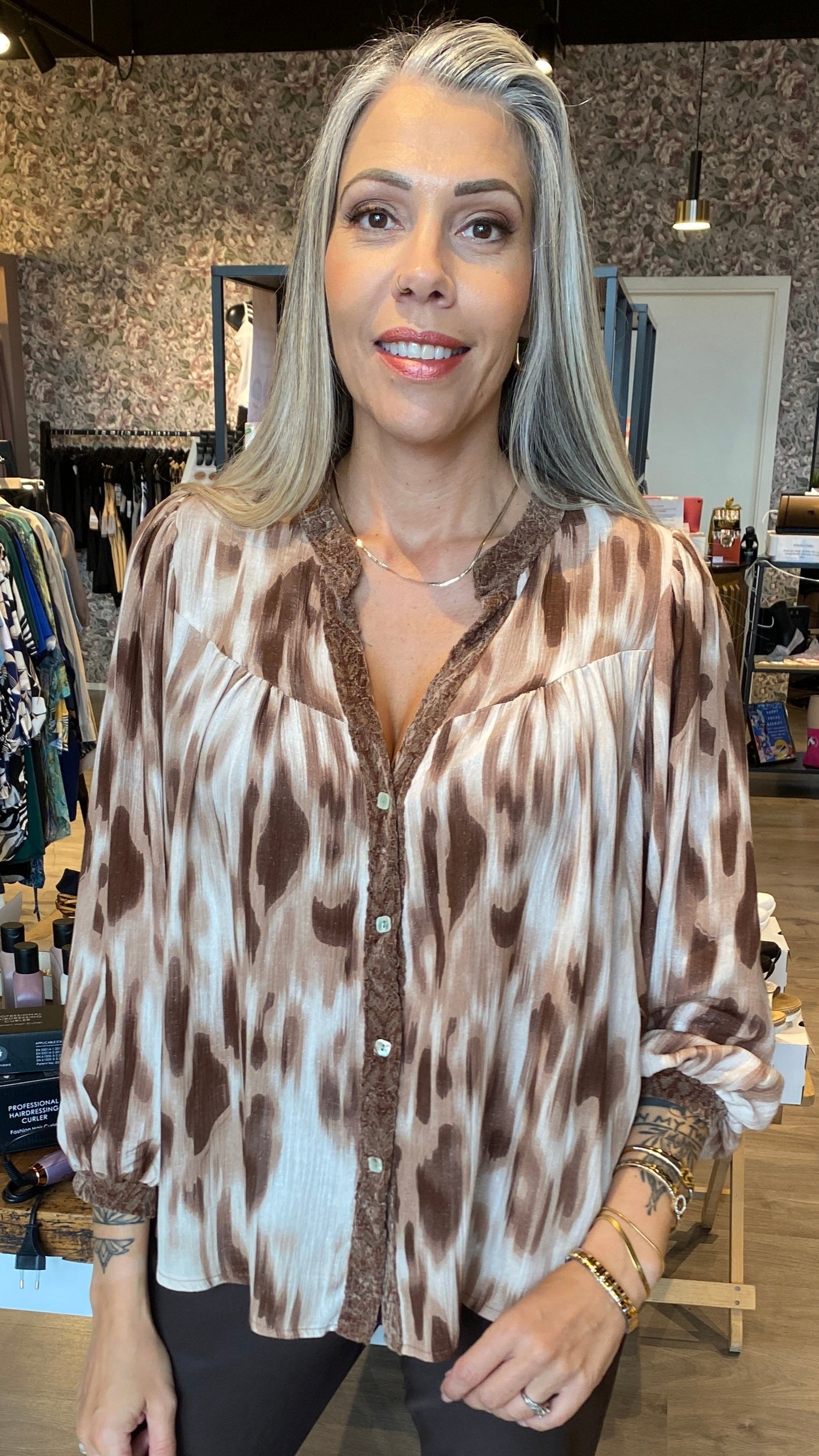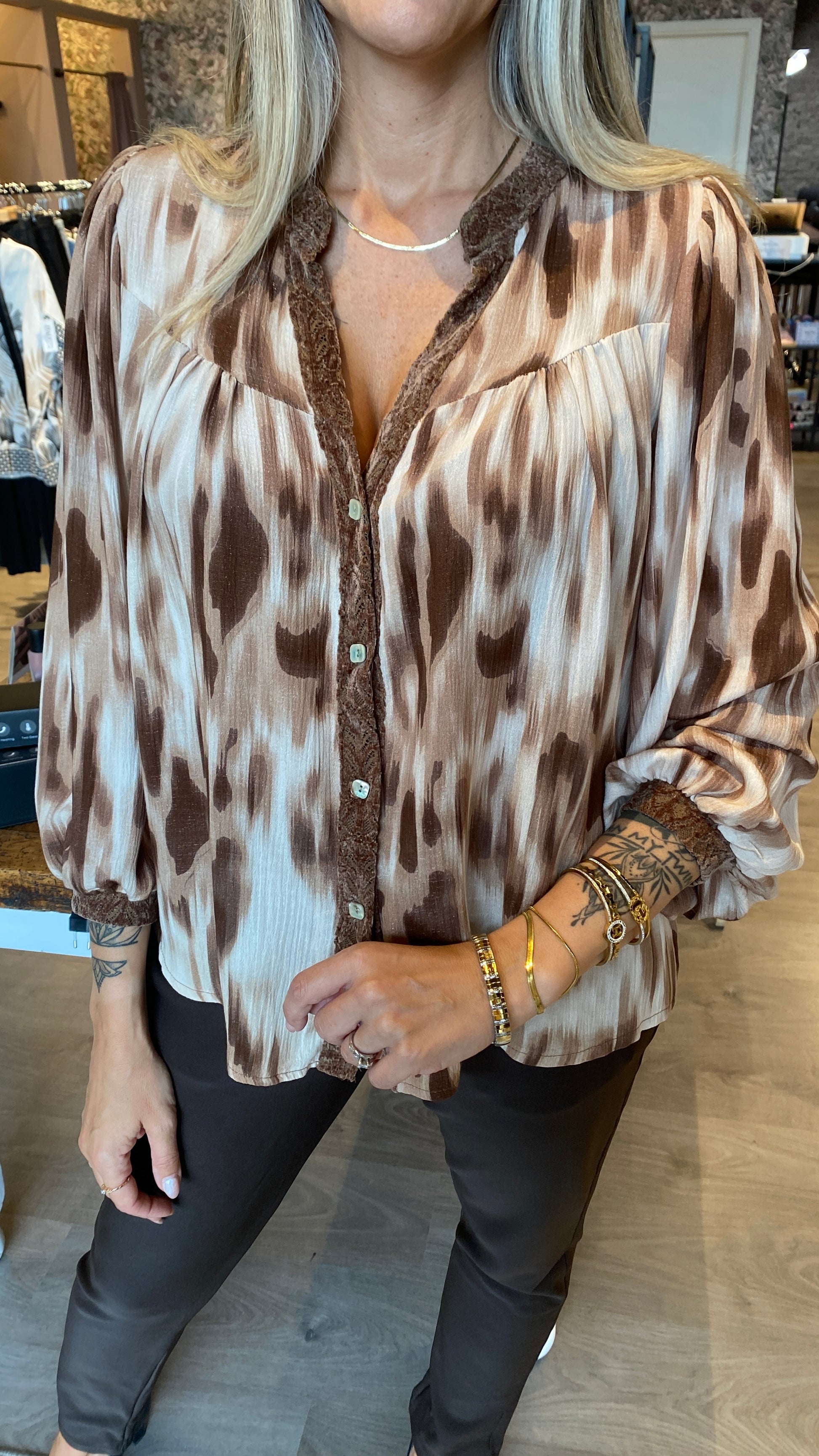 Sparileg brúntóna hneppt skyrta með velour bróderingu í hálsmáli og ermum. Hvart ermar.