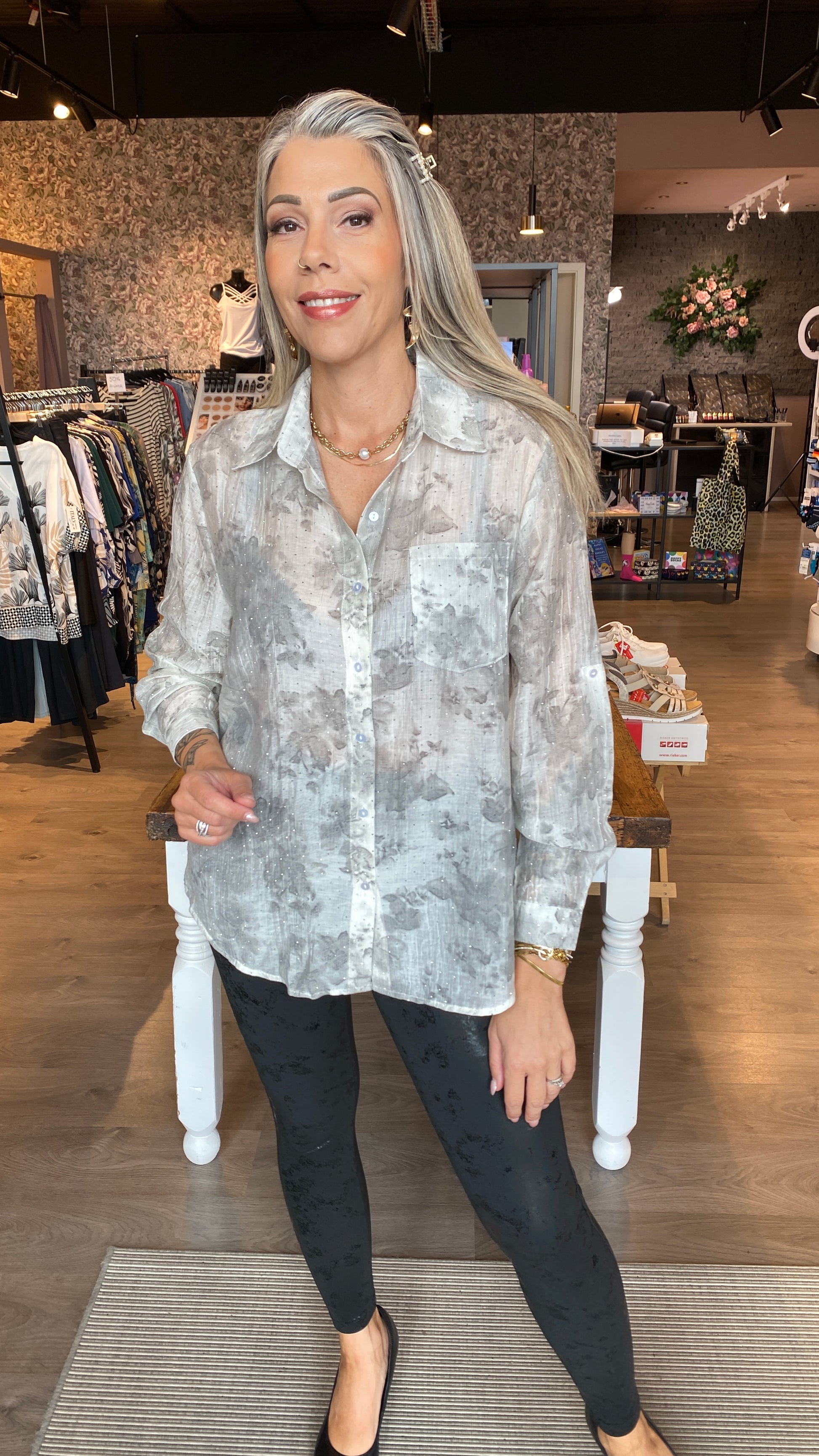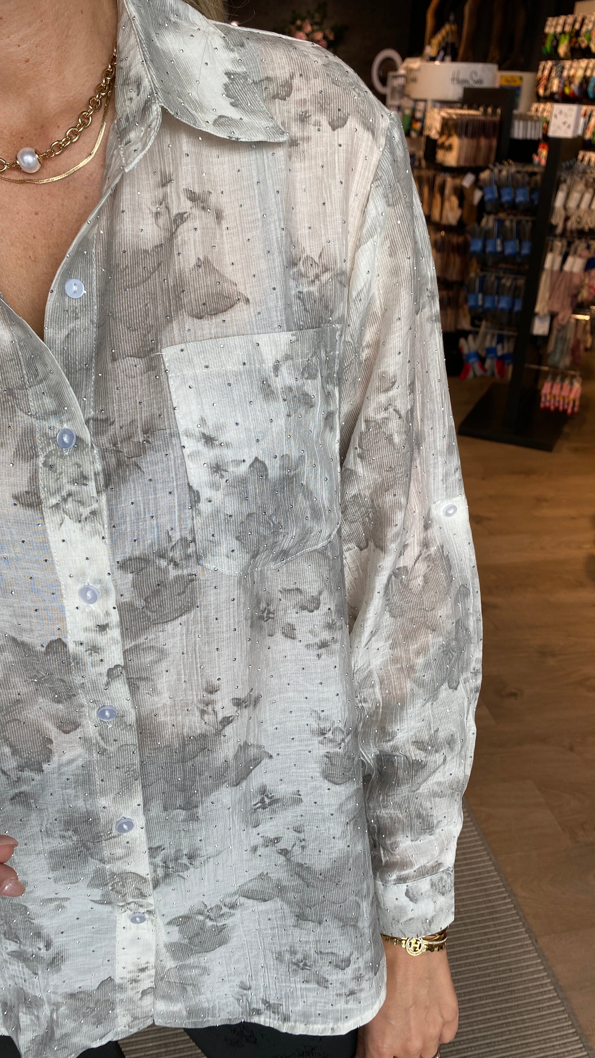 Sparileg og falleg hvít skyrta með gráu blómamunstri og glimmeri. Einn brjóstvasi að framan.