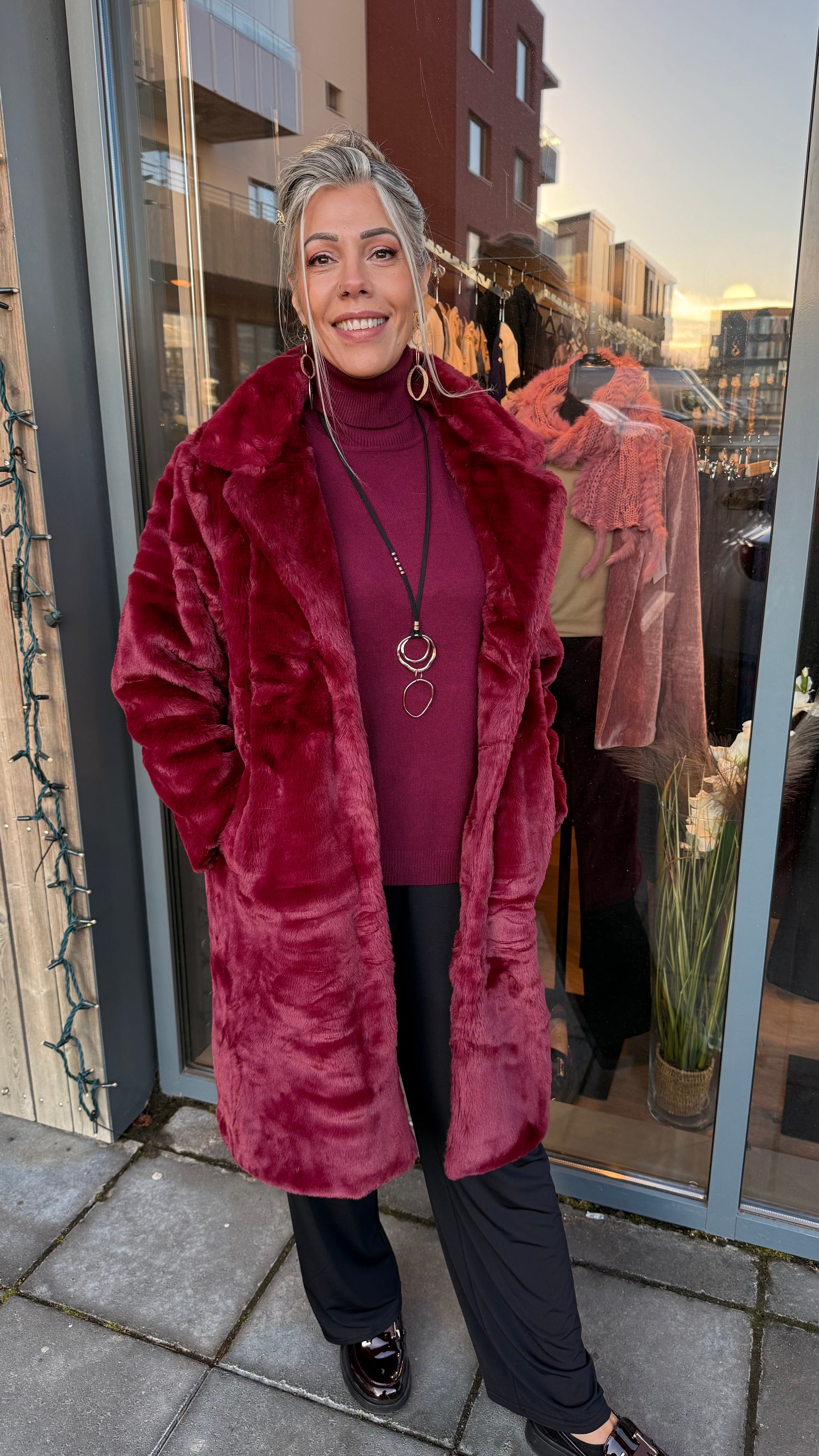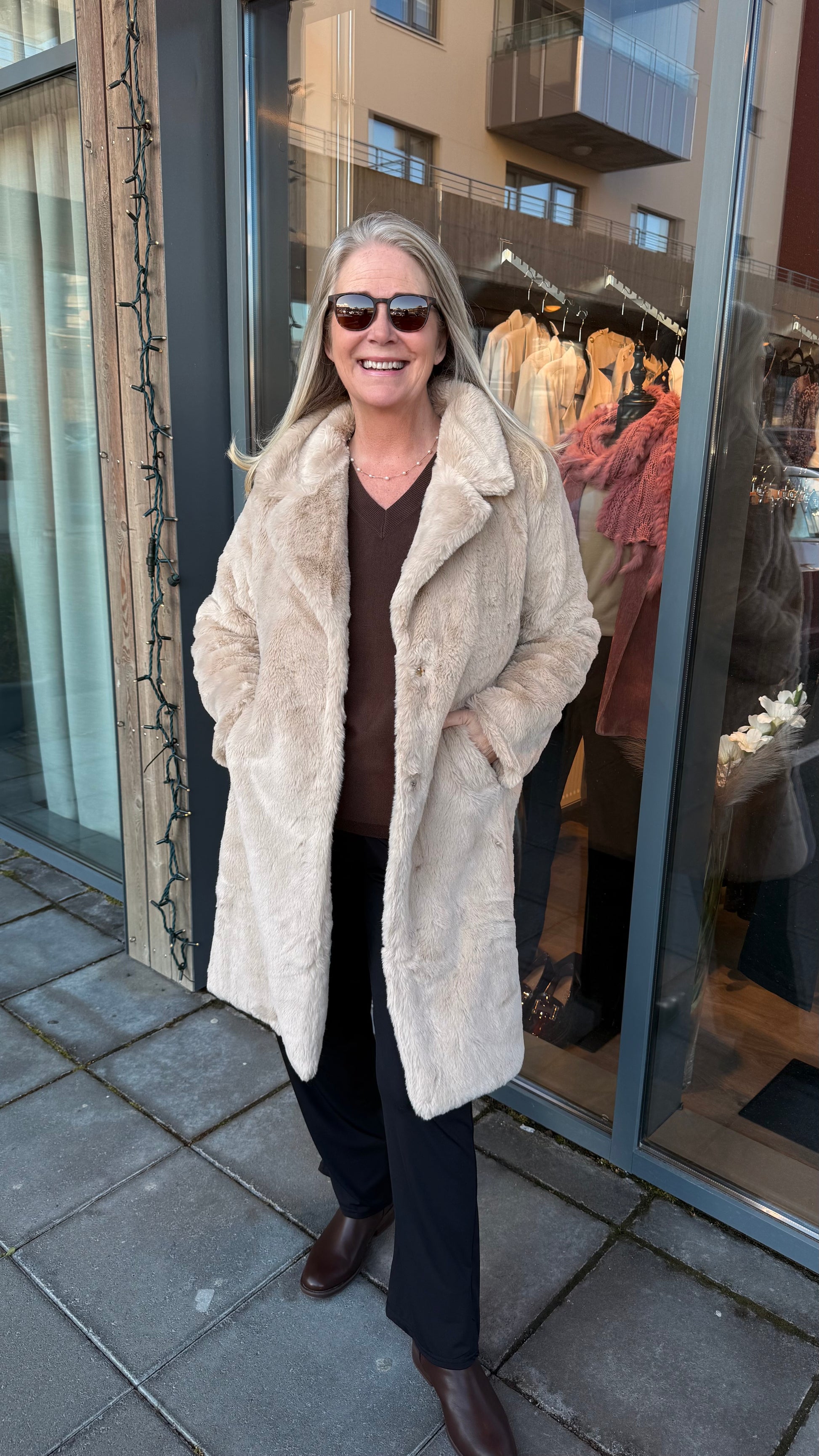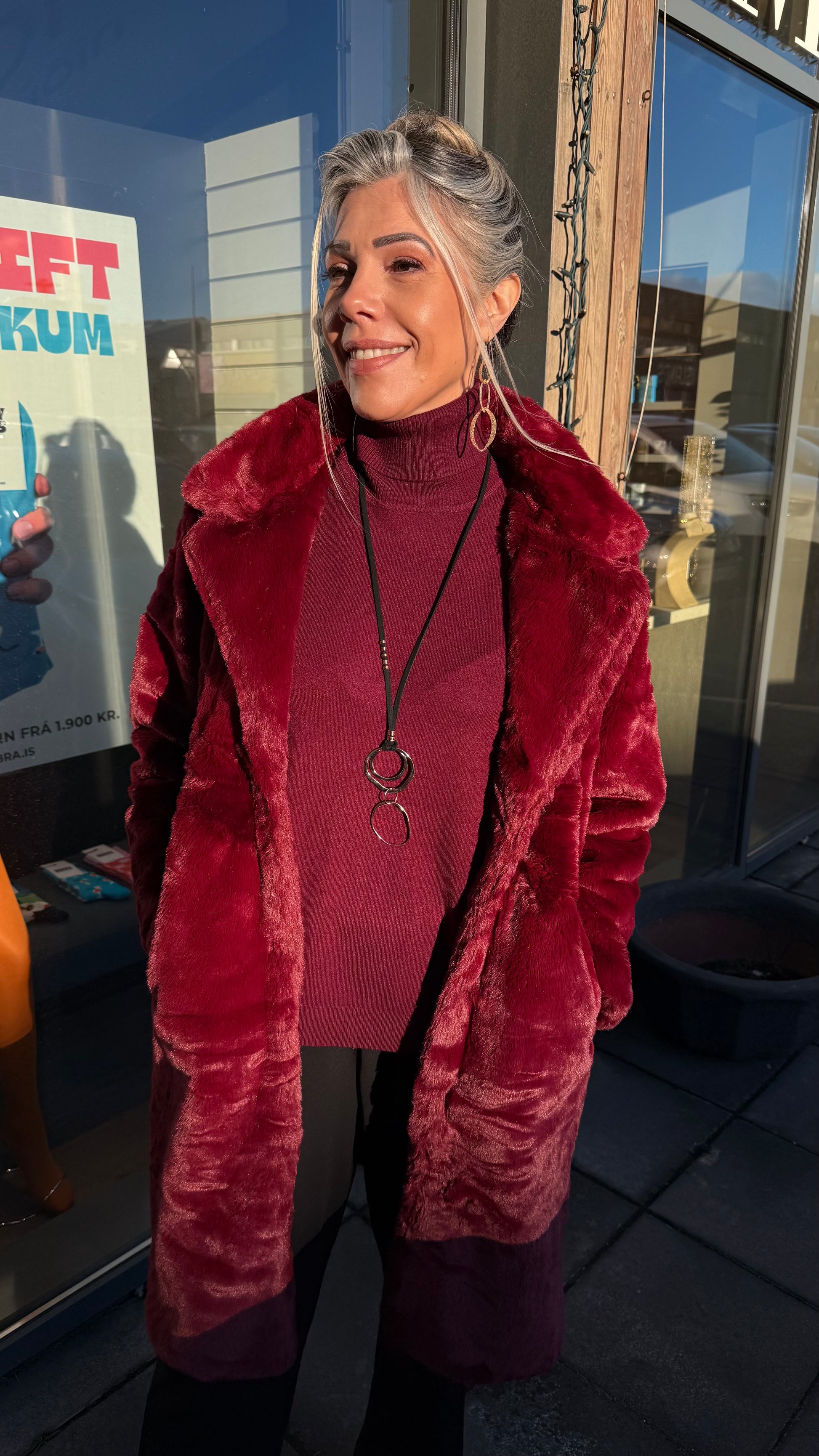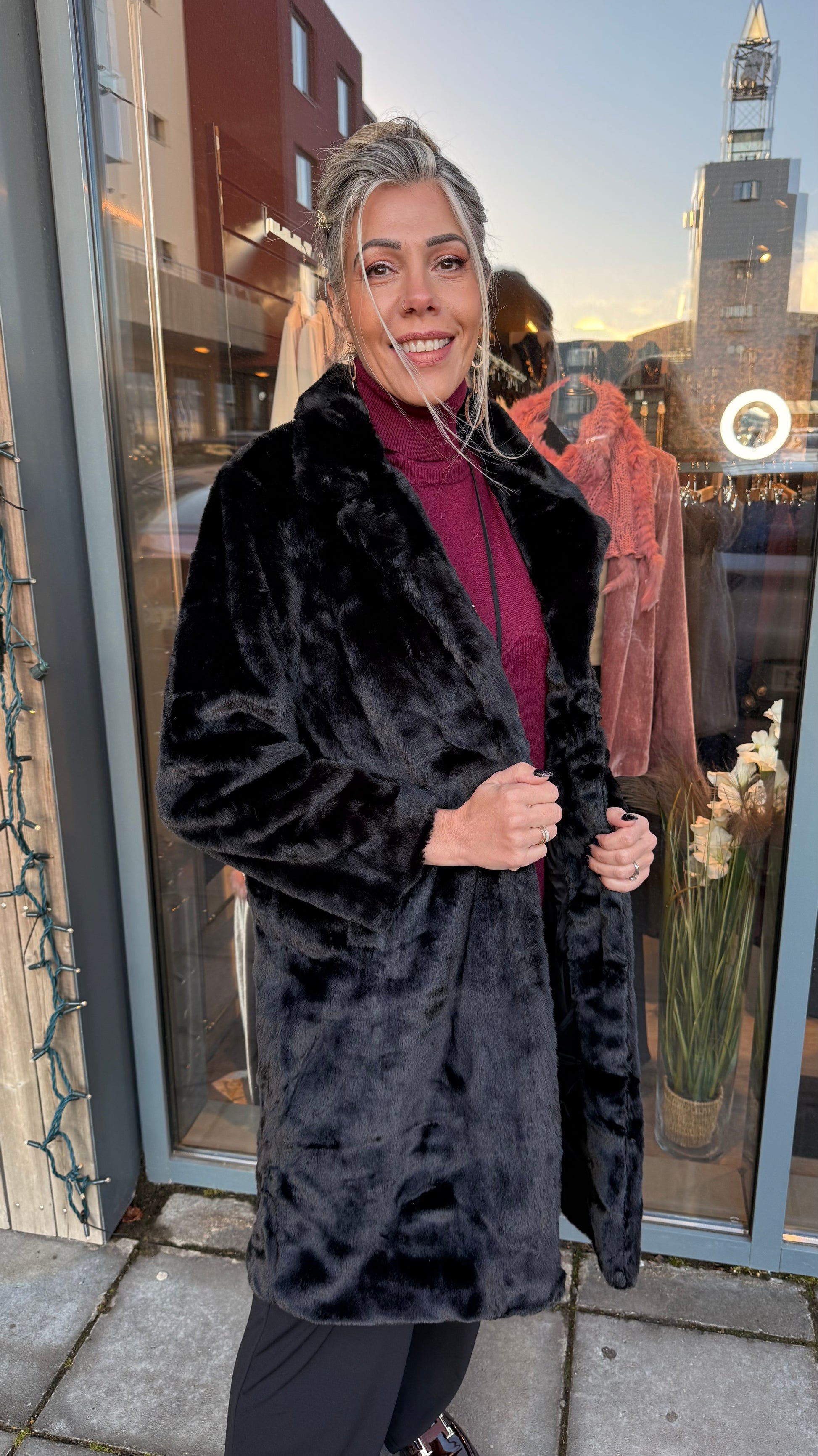 Fallegur, hlýr og mjúkur pels, Pelsinn er fóðraður að innan og með tveim vösum að frama. Pelsinn lokast með tveim smellum.