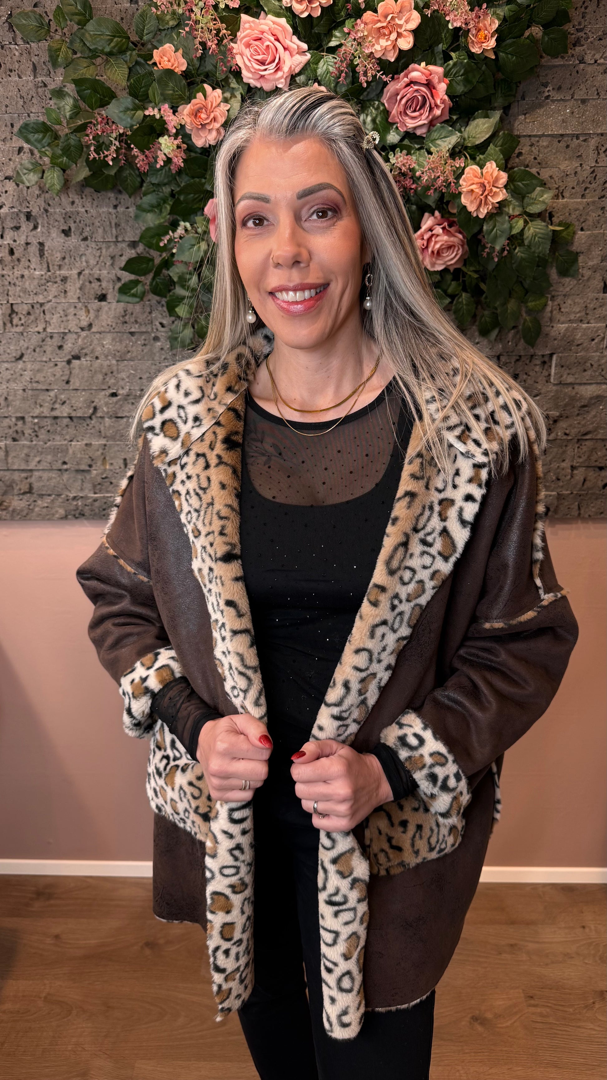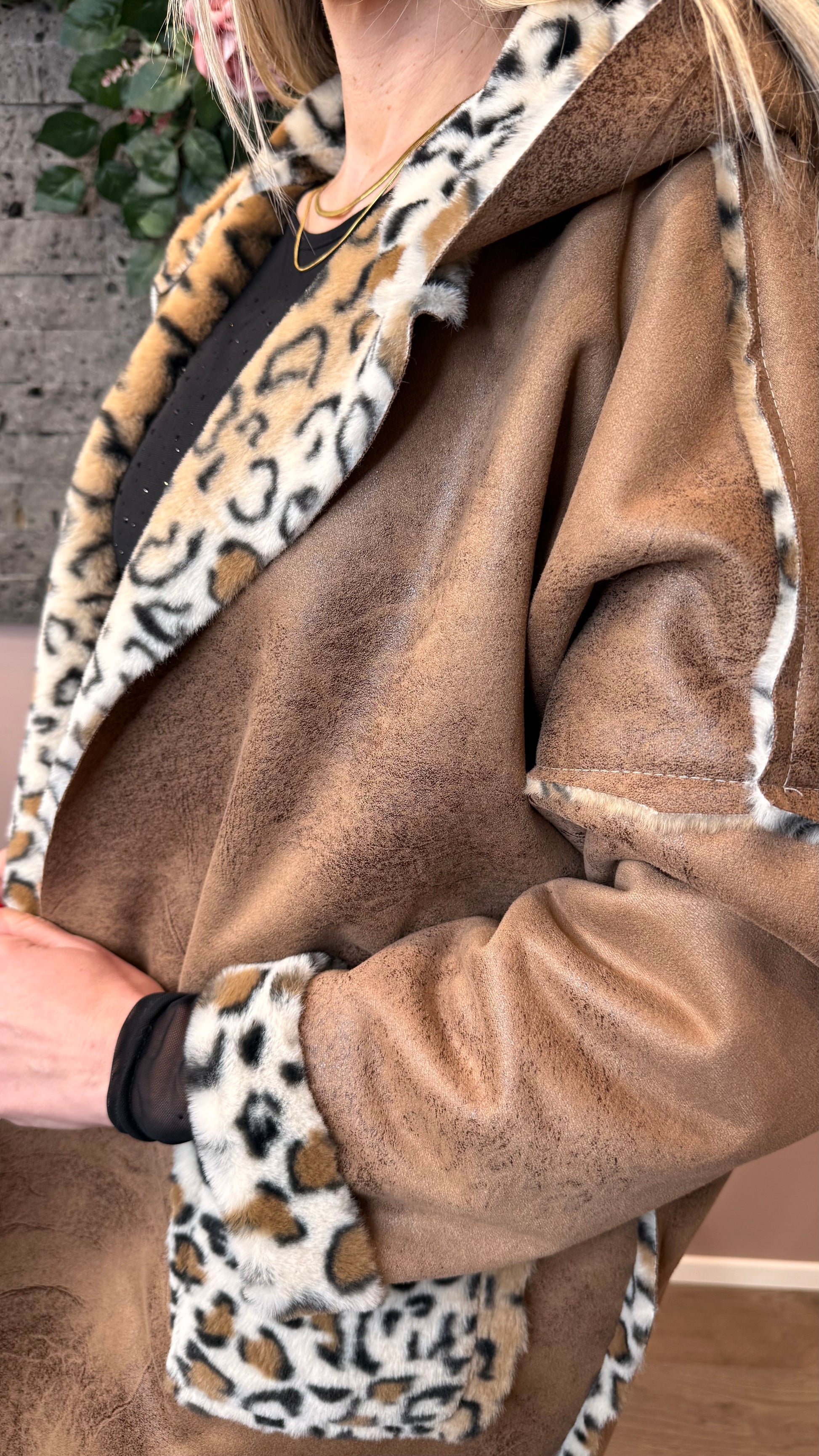 Einstaklega fallegur vegan rúskinn pels jakki sem hægt er að snúa á tvo vegu, annars vegar að láta mjúka dýramunstrið snúa út eða rúskinnið. Tveir vasar að framan báðu megin.