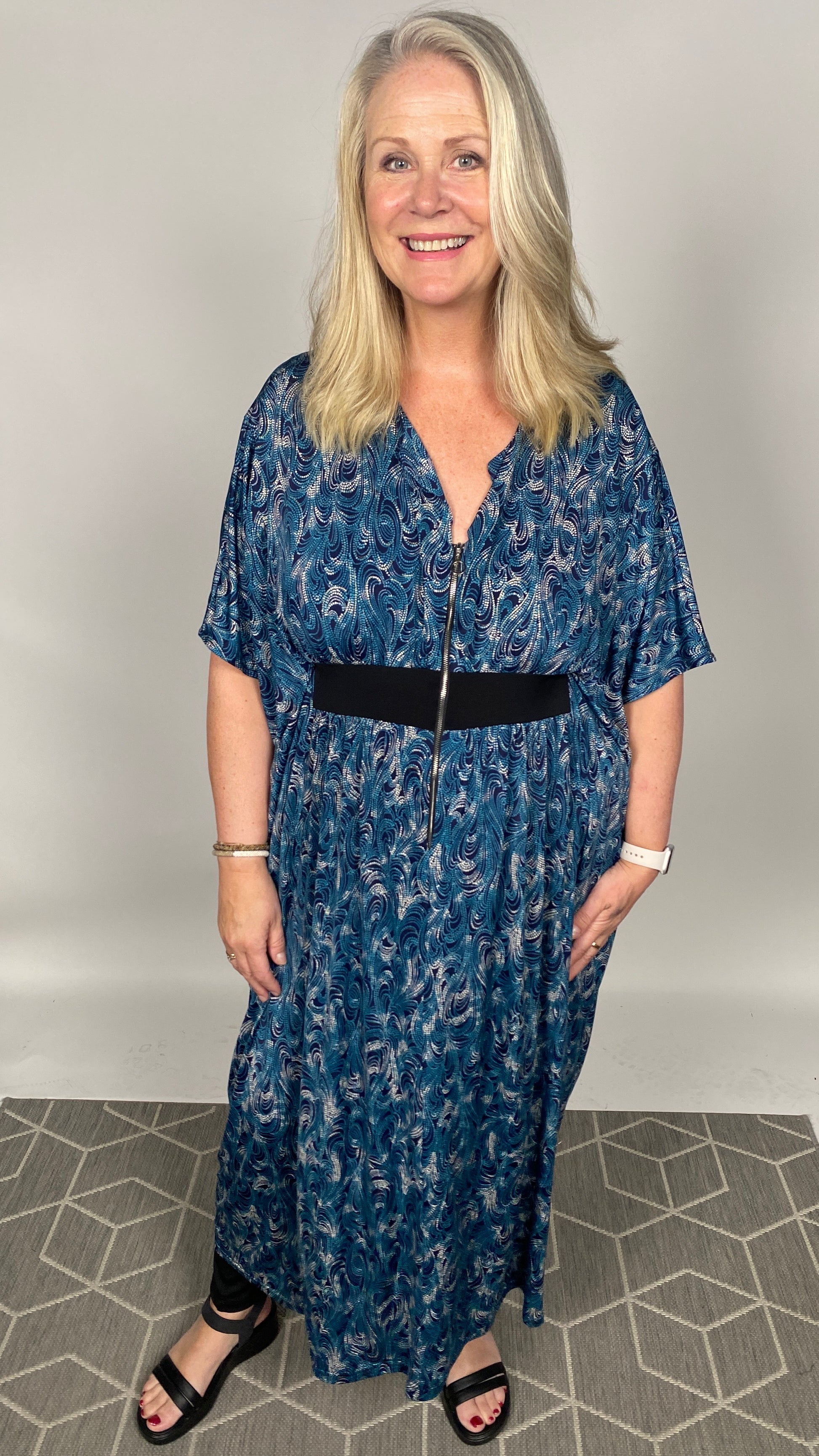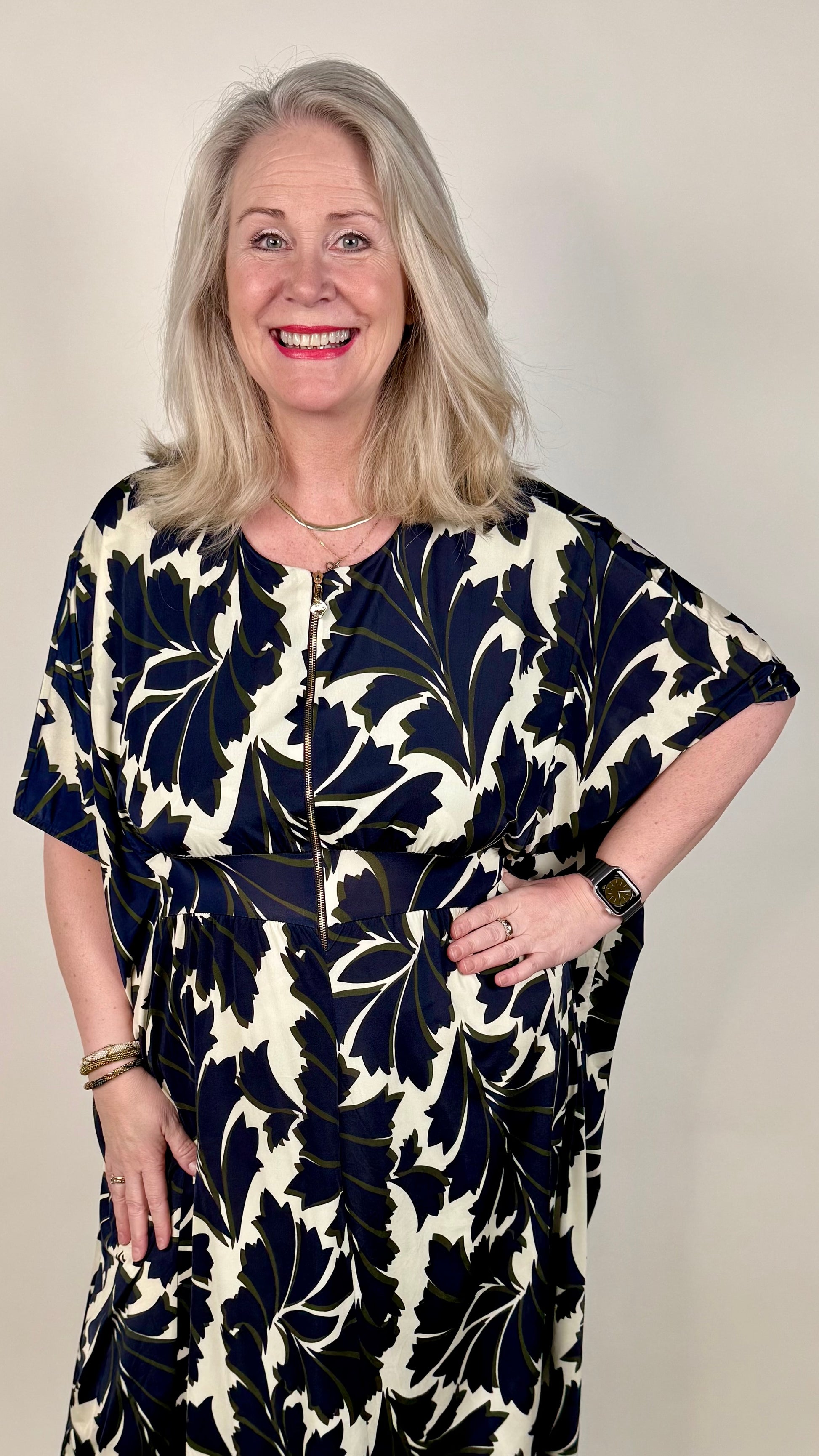 Kjóllinn er í einni stærð, sem hentar vel fyrir 40-52. Það er mikil teygja í efninu og bandið að innan gerir það að verkum að kjóllinn er mjög vel sniðinn að hverjum og einum.