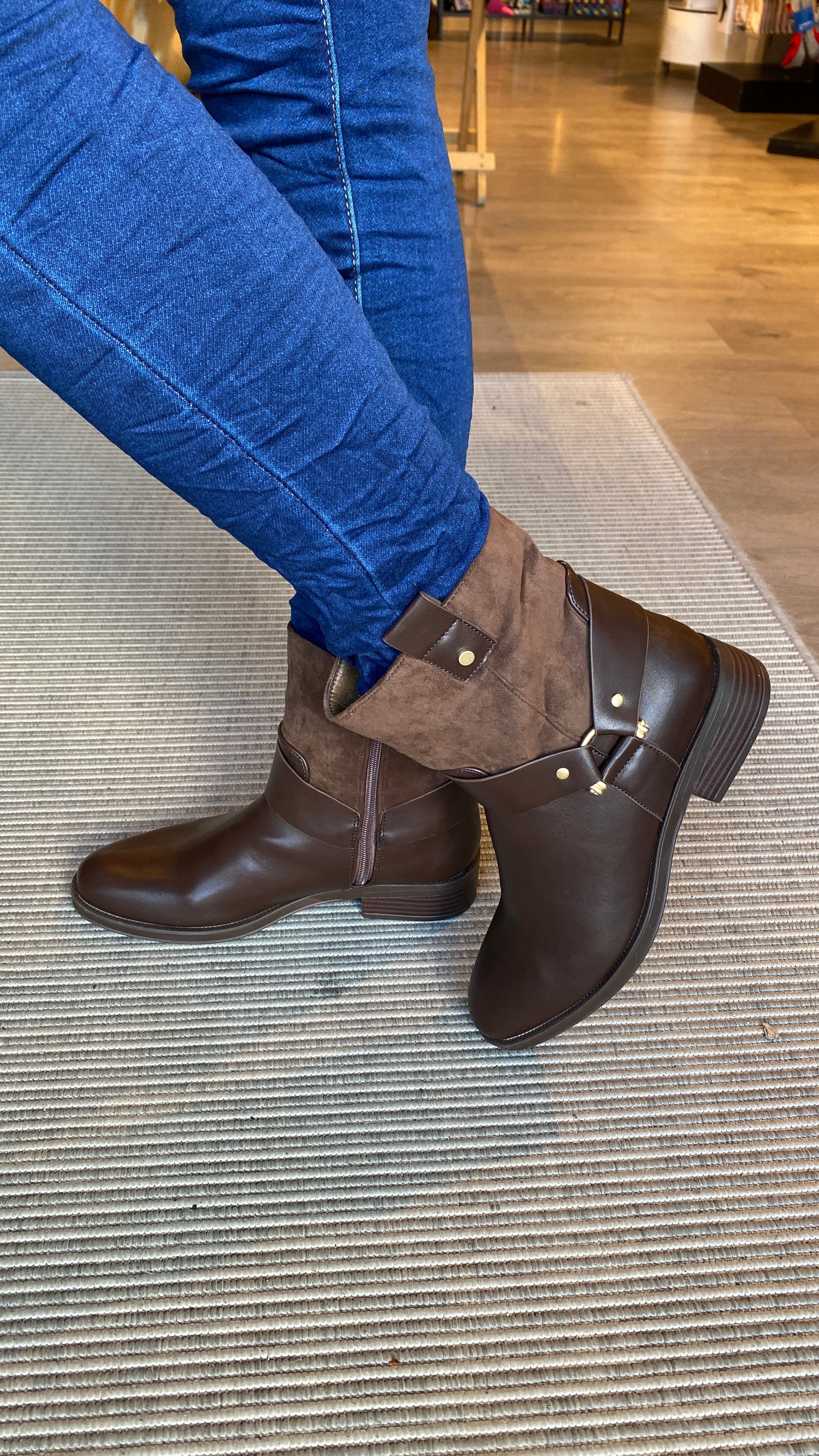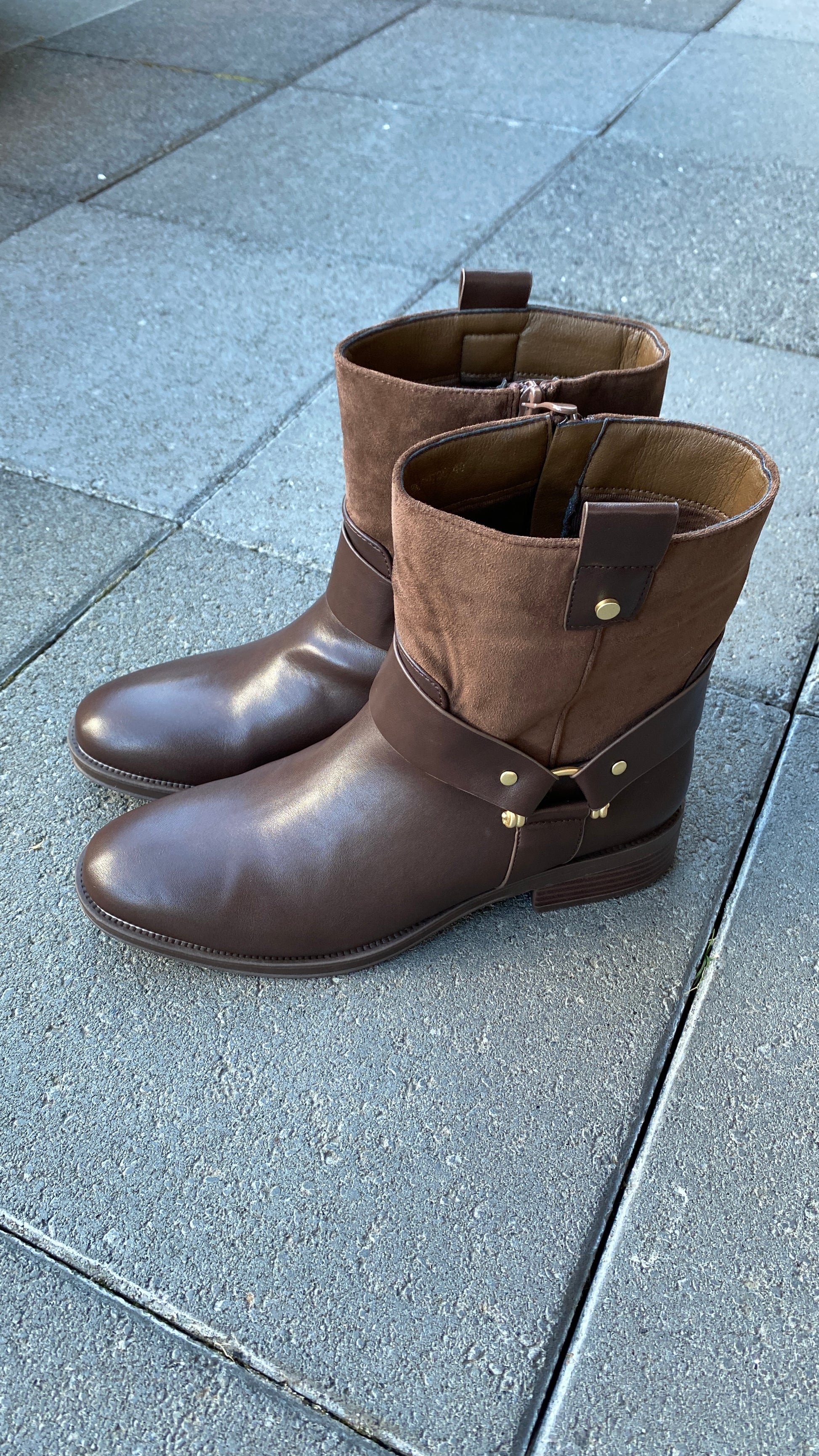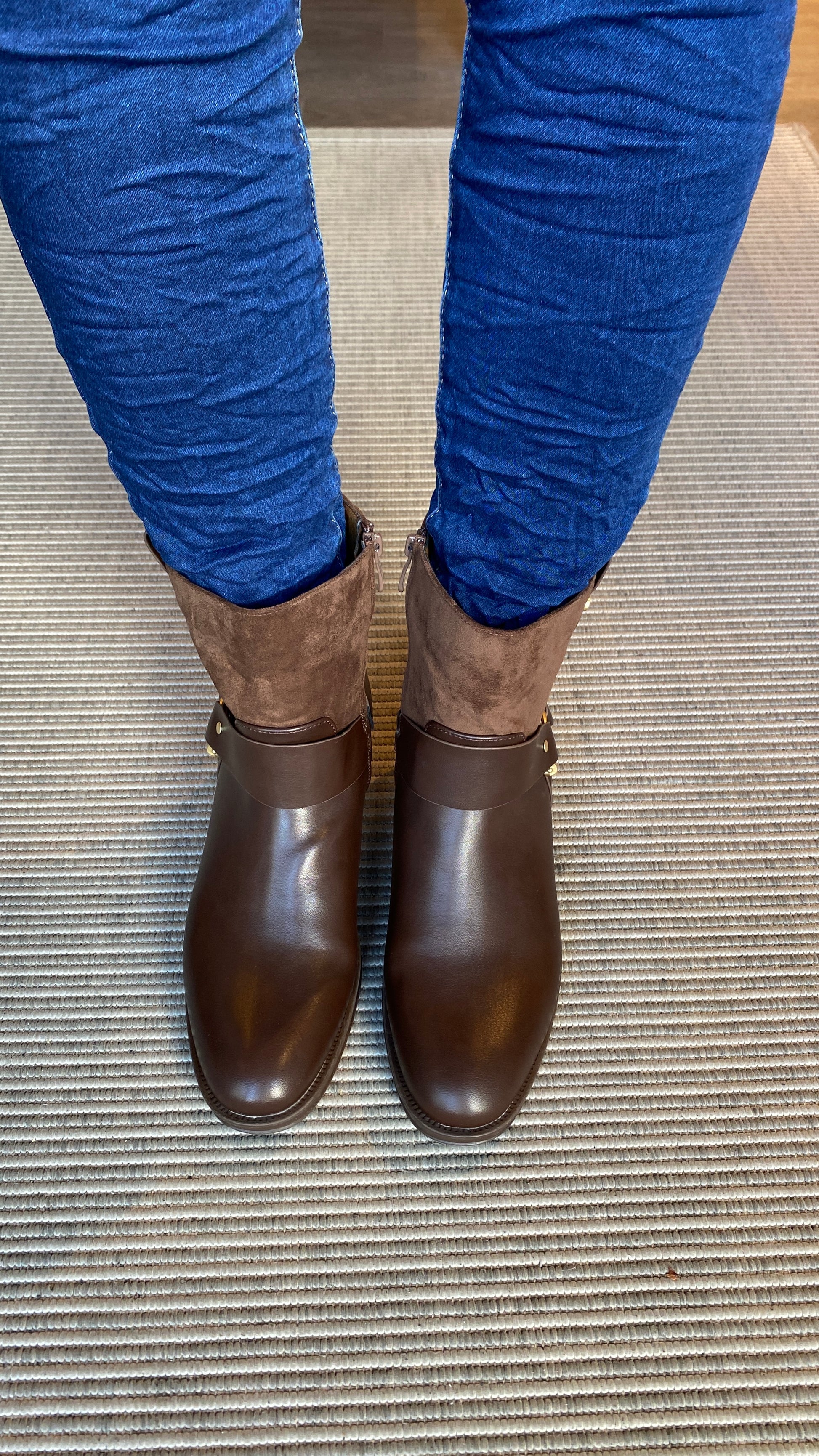 Flott lág stígvél ú vegan leðri og rúskinnni, rennilás á hliðinni, lágir hælar og gyllt spenna á hliðinni.