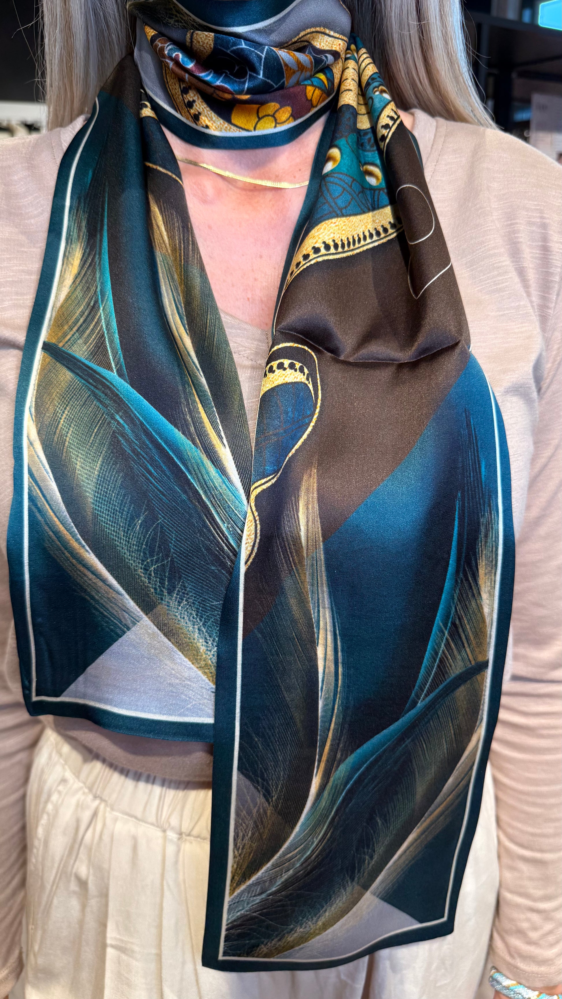 Fallegur langur klútur með grænu, brúnu og gyltu munstri.
