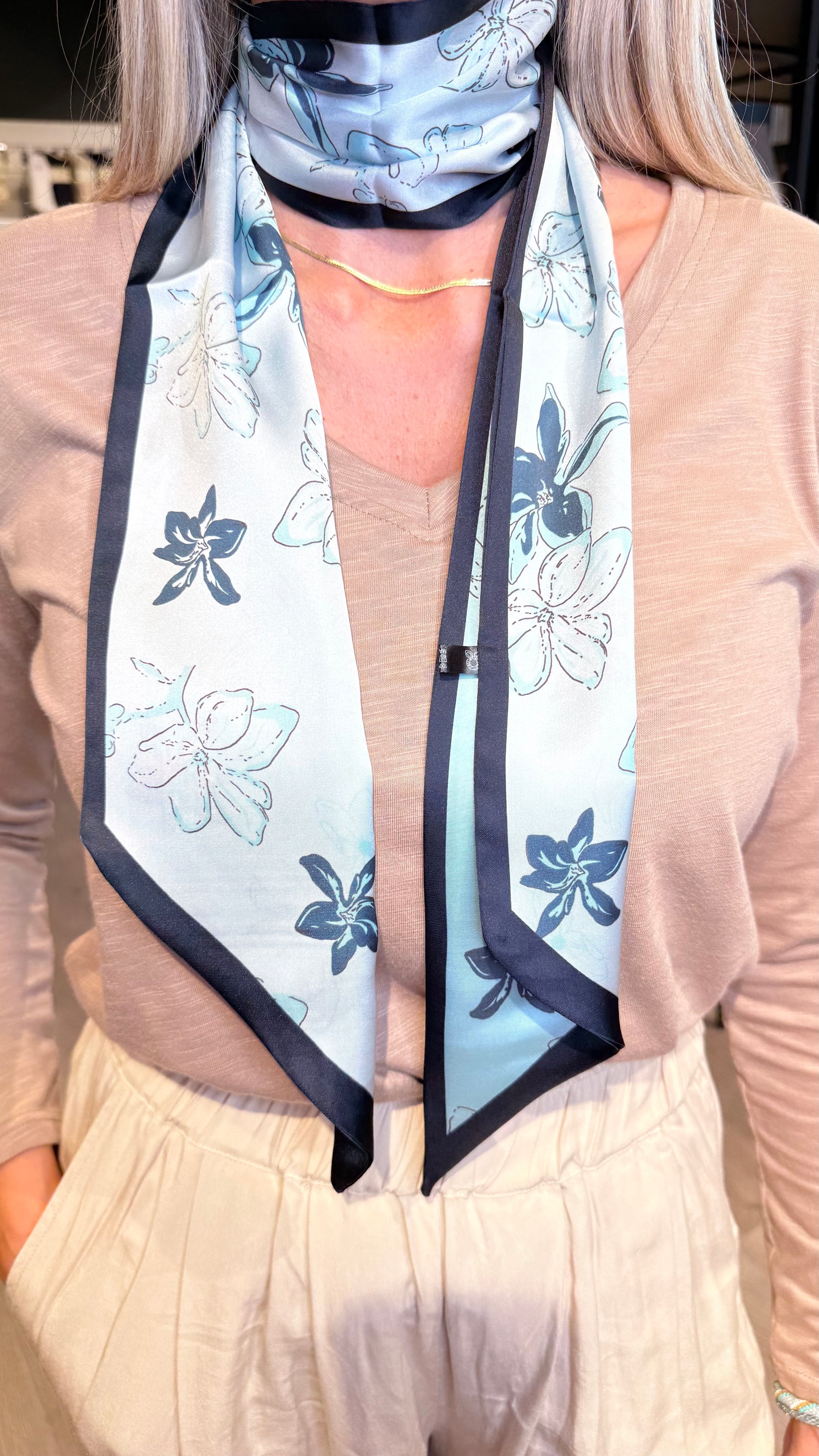 Fallegur langur klútur með bláum og ljósbláum blómum.