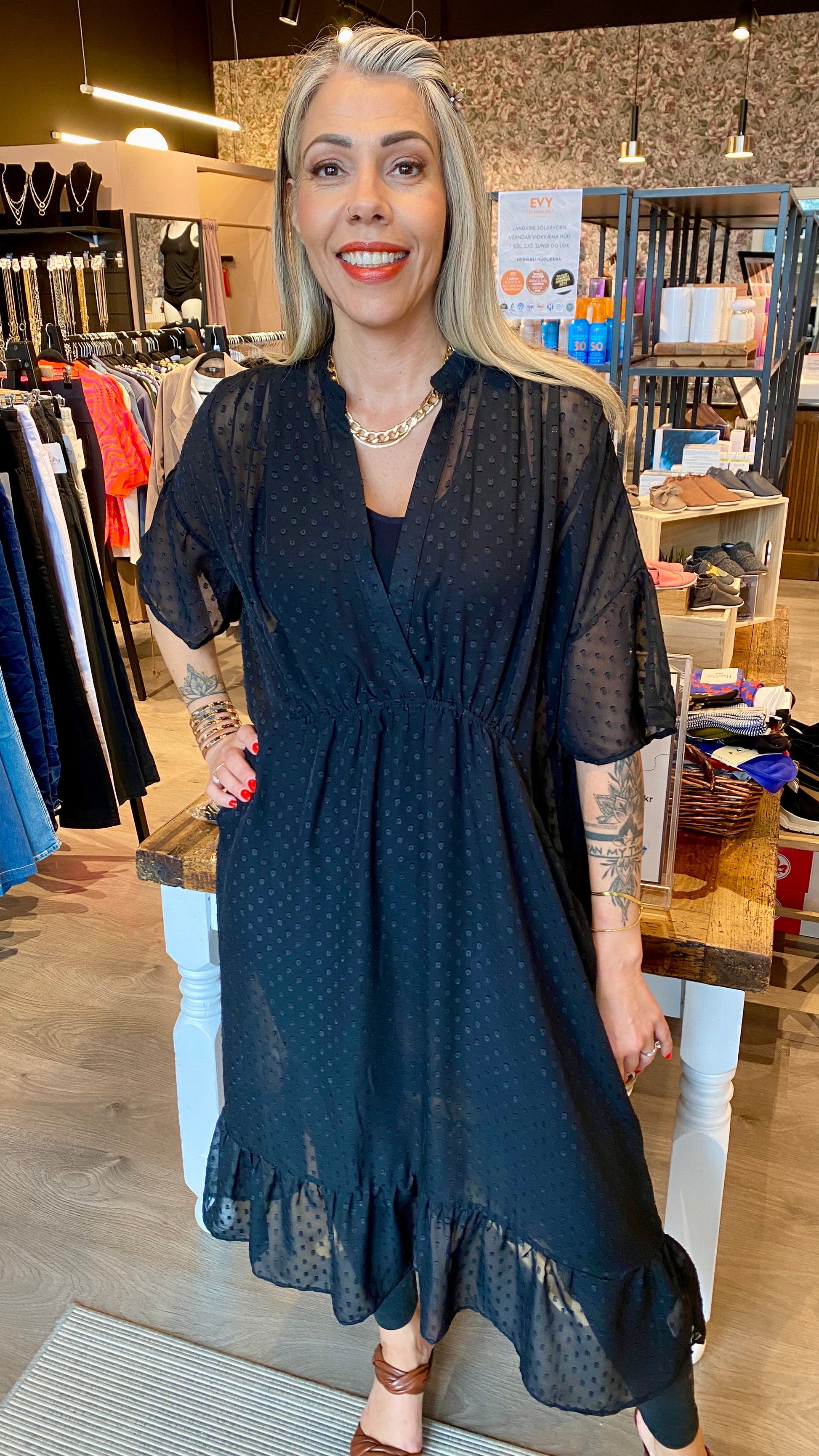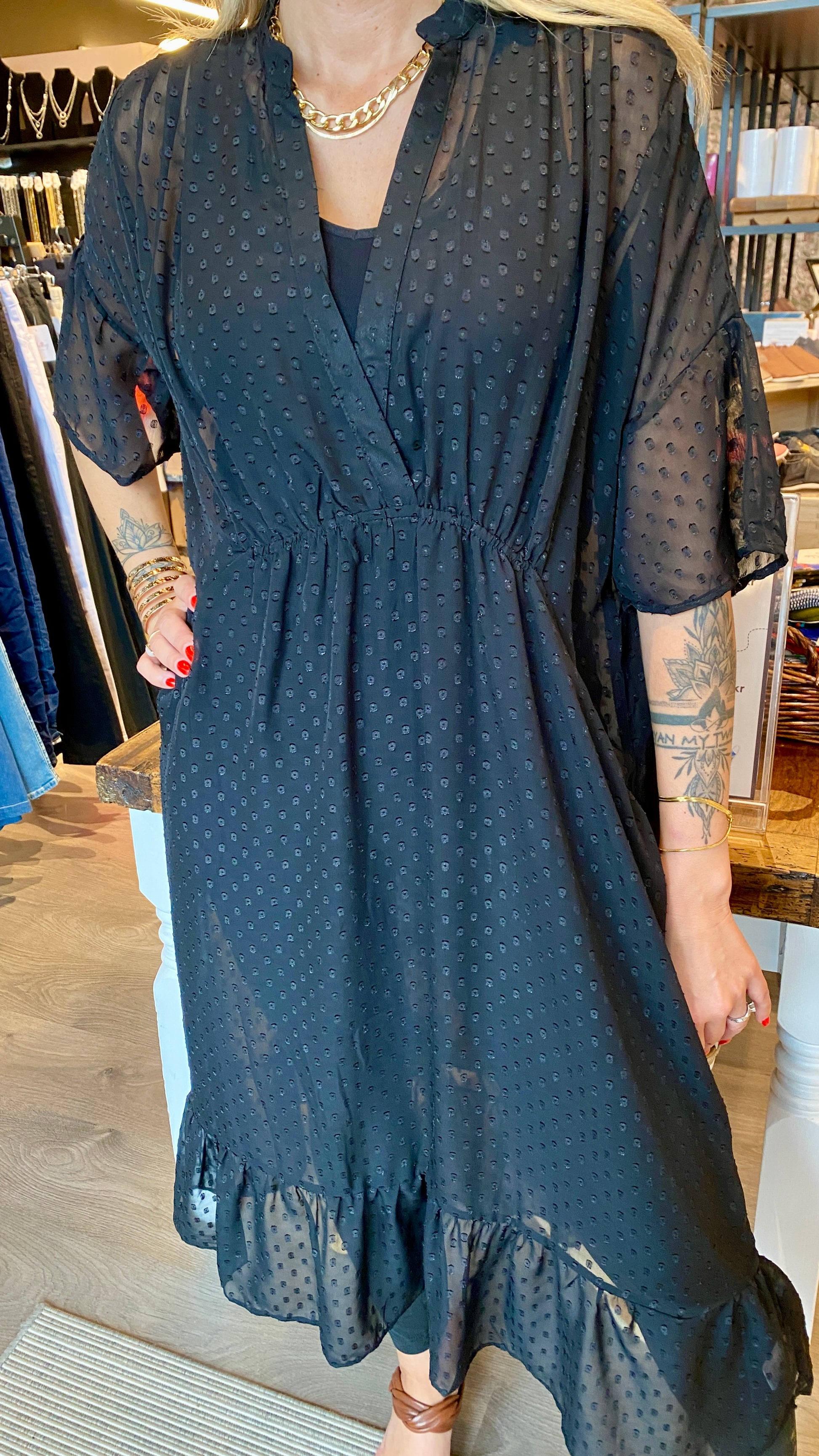 Fallegur svartur kjóll úr þunnu gegnsægju efni með doppu munstri og vhálsmáli, teygju undir brjóstum vítt snið með hliðar vösum, kvart ermum og pífu neðst.