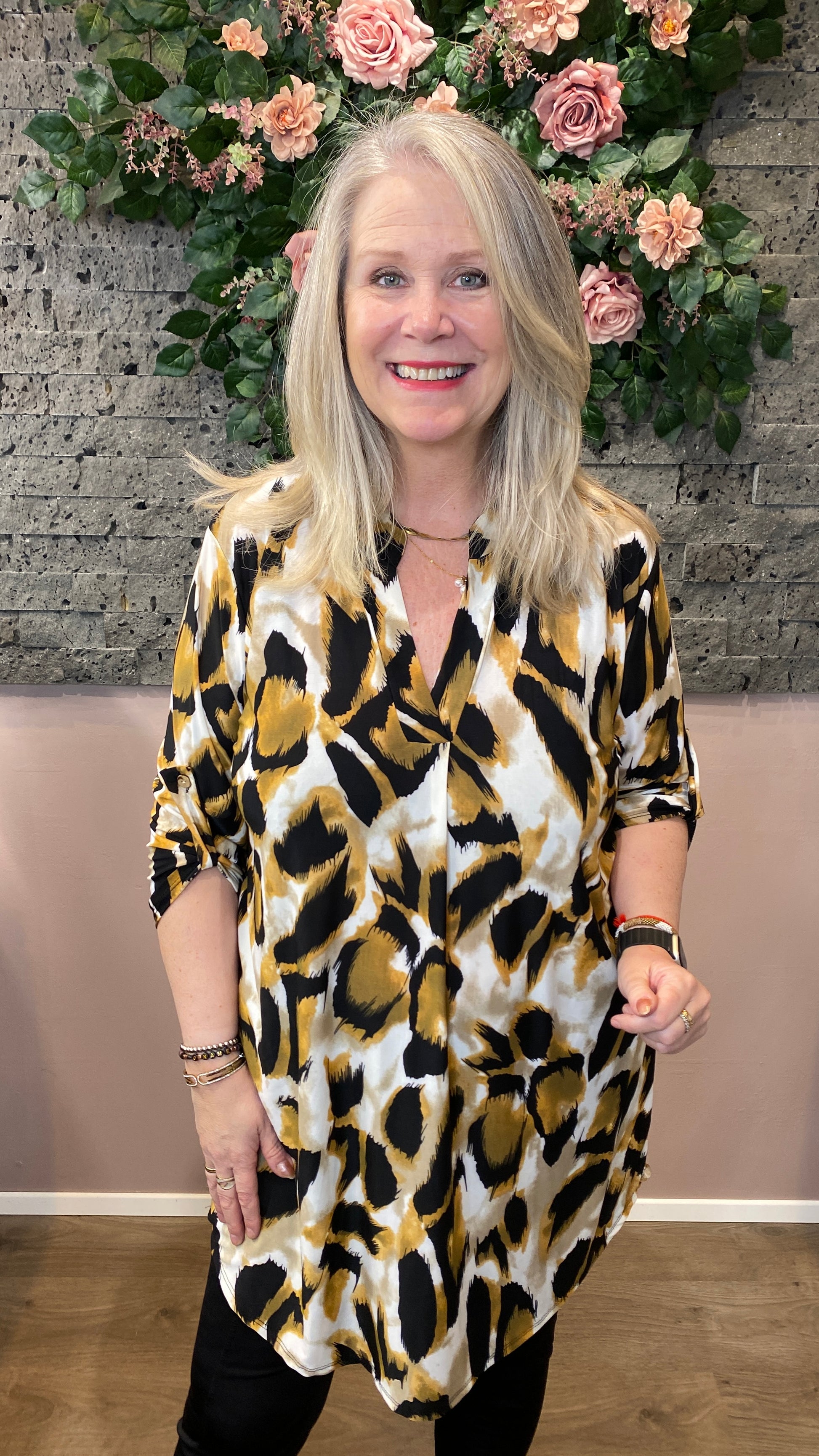 Klassíski og vinsæli mæjukjóllinn okkar sem er mjög klæðilegur, Kjóllinn er með kvartermum sem hægt er að hneppa upp. Léttur kjóll úr góðu teygjanlegu efni.
