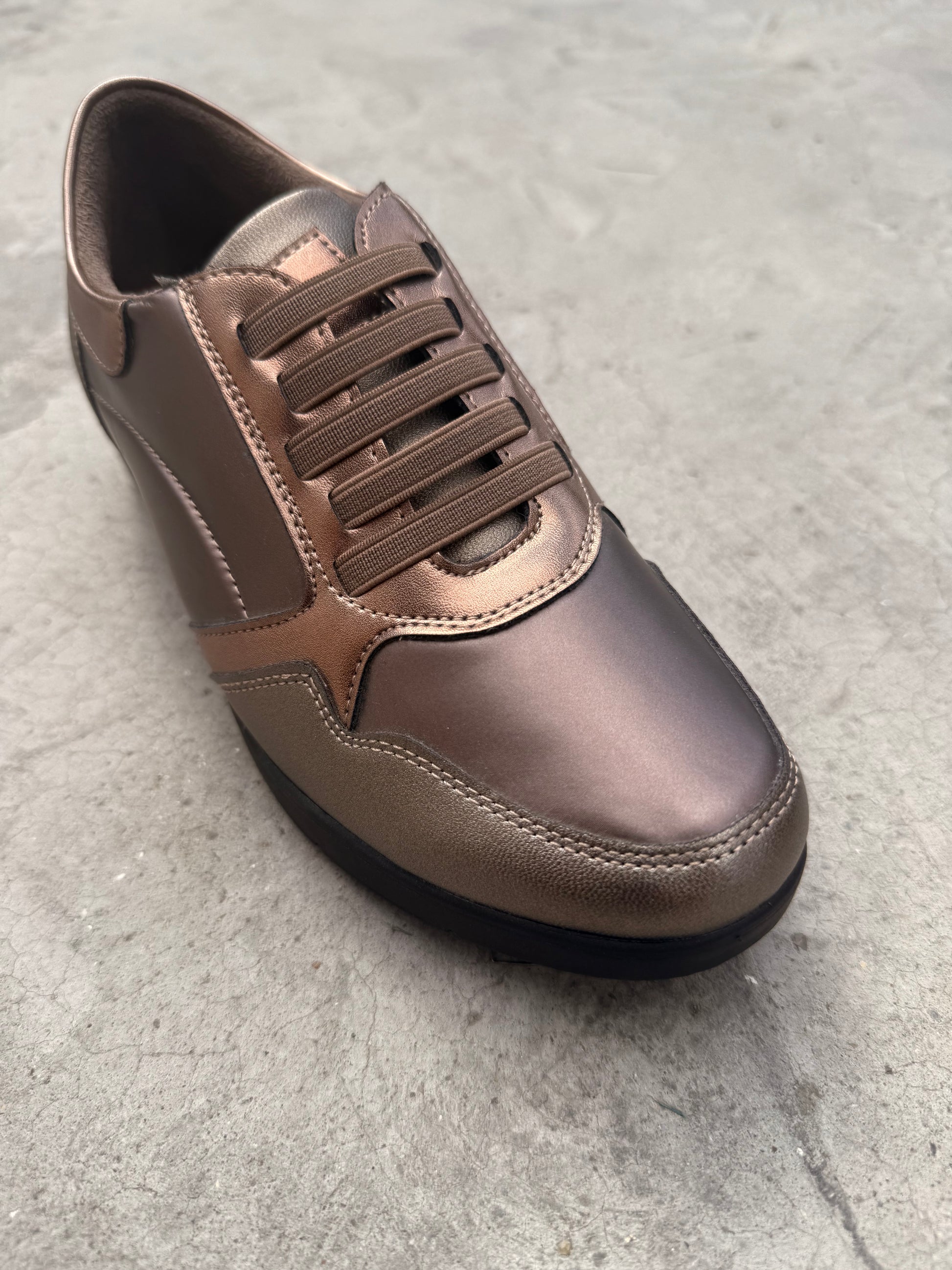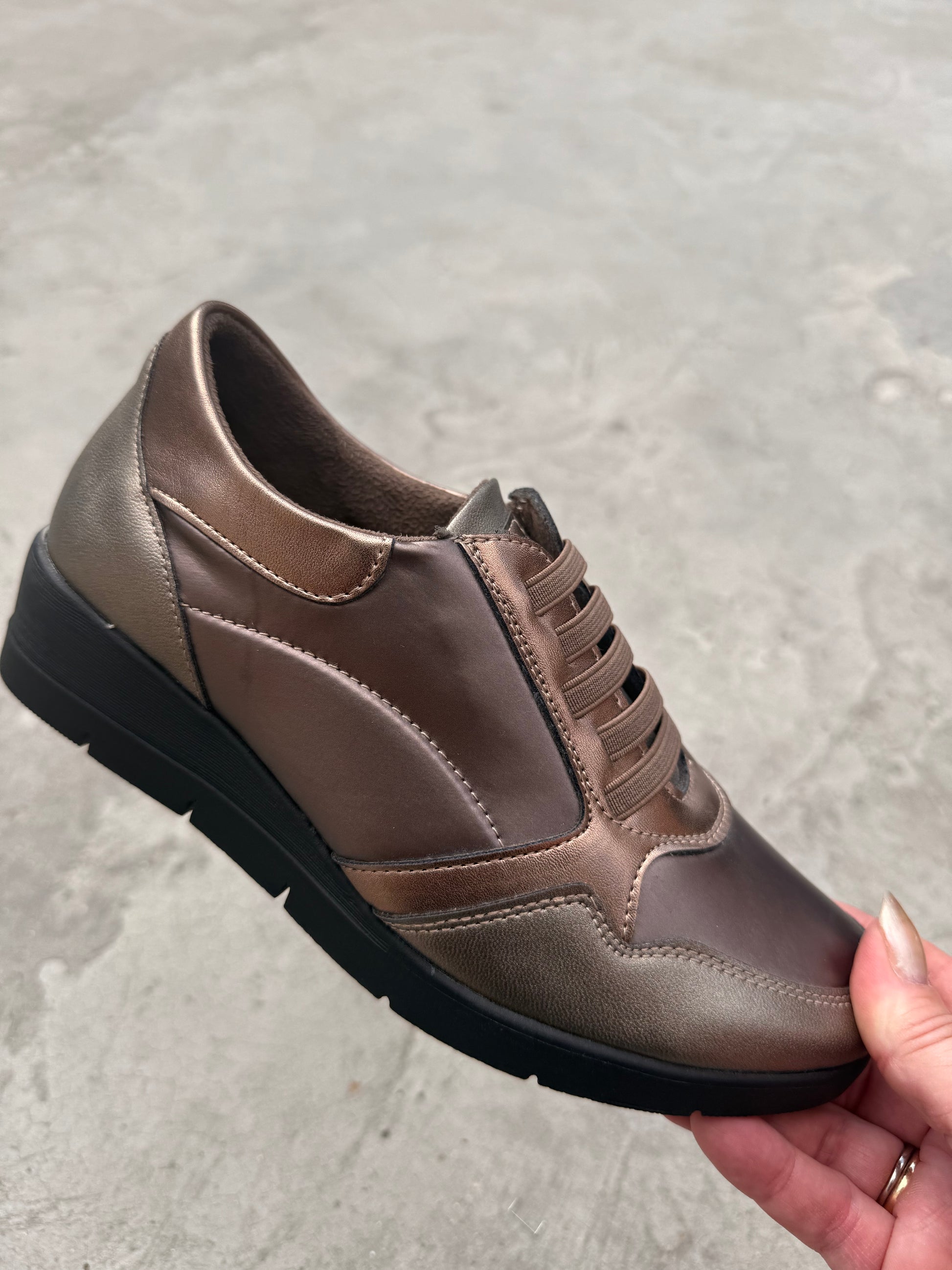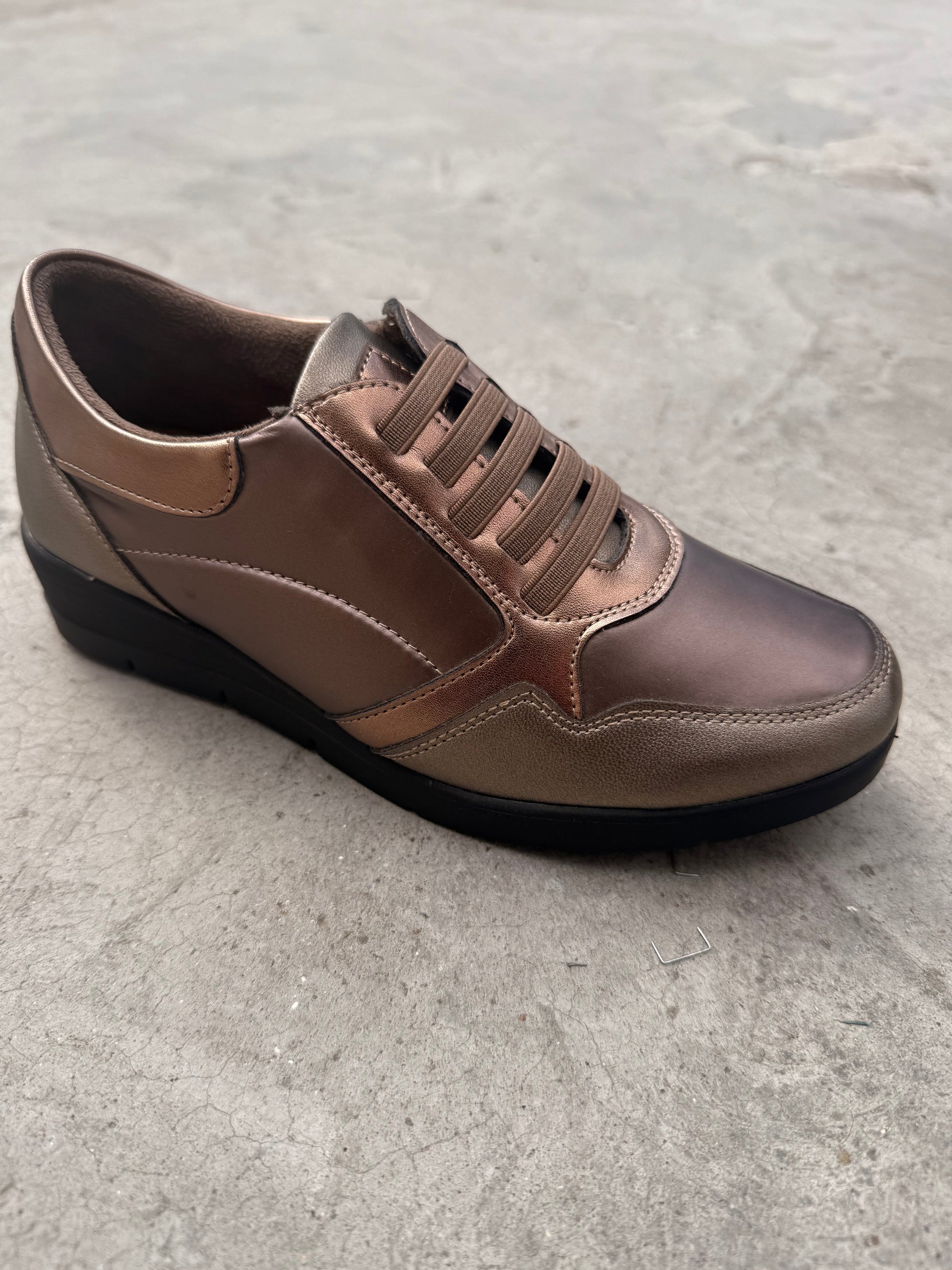 Mjög smartir og mjúkir brúngylltir strigaskór. svartur botn og teygja í stað reima.
