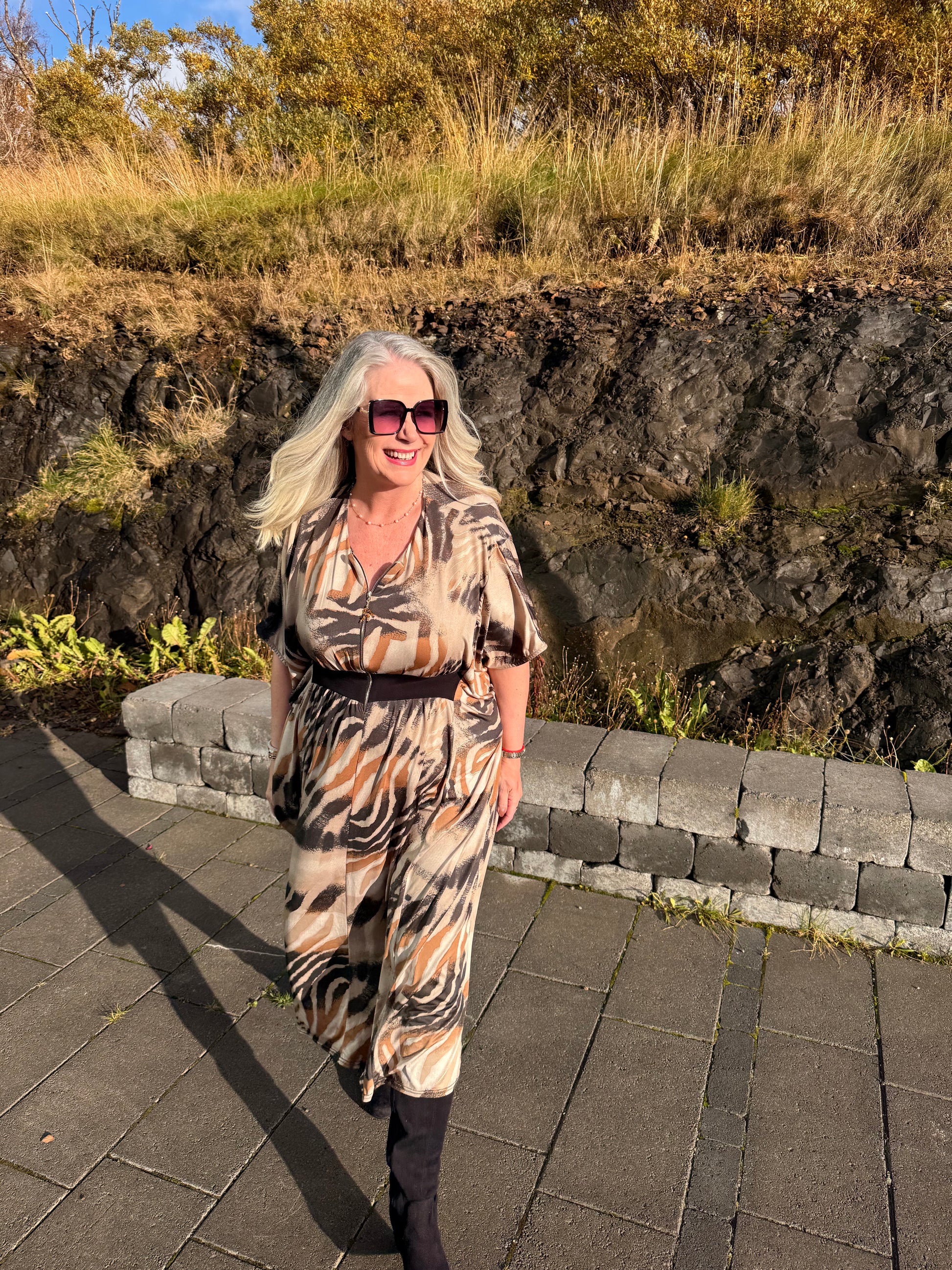Kjóllinn er í einni stærð, sem hentar vel fyrir 40-52. Það er mikil teygja í efninu og bandið að innan gerir það að verkum að kjóllinn er mjög vel sniðinn að hverjum og einum.