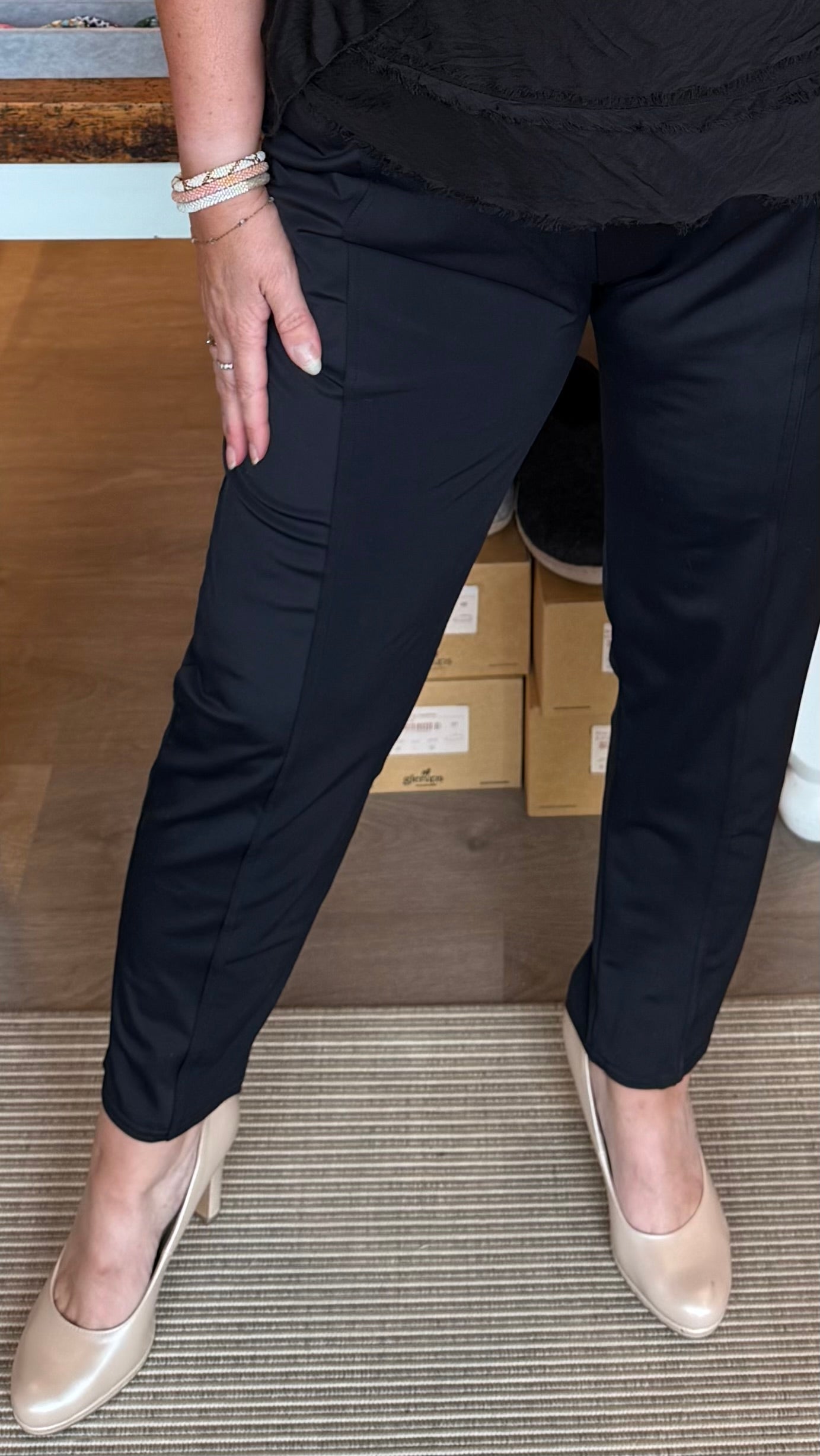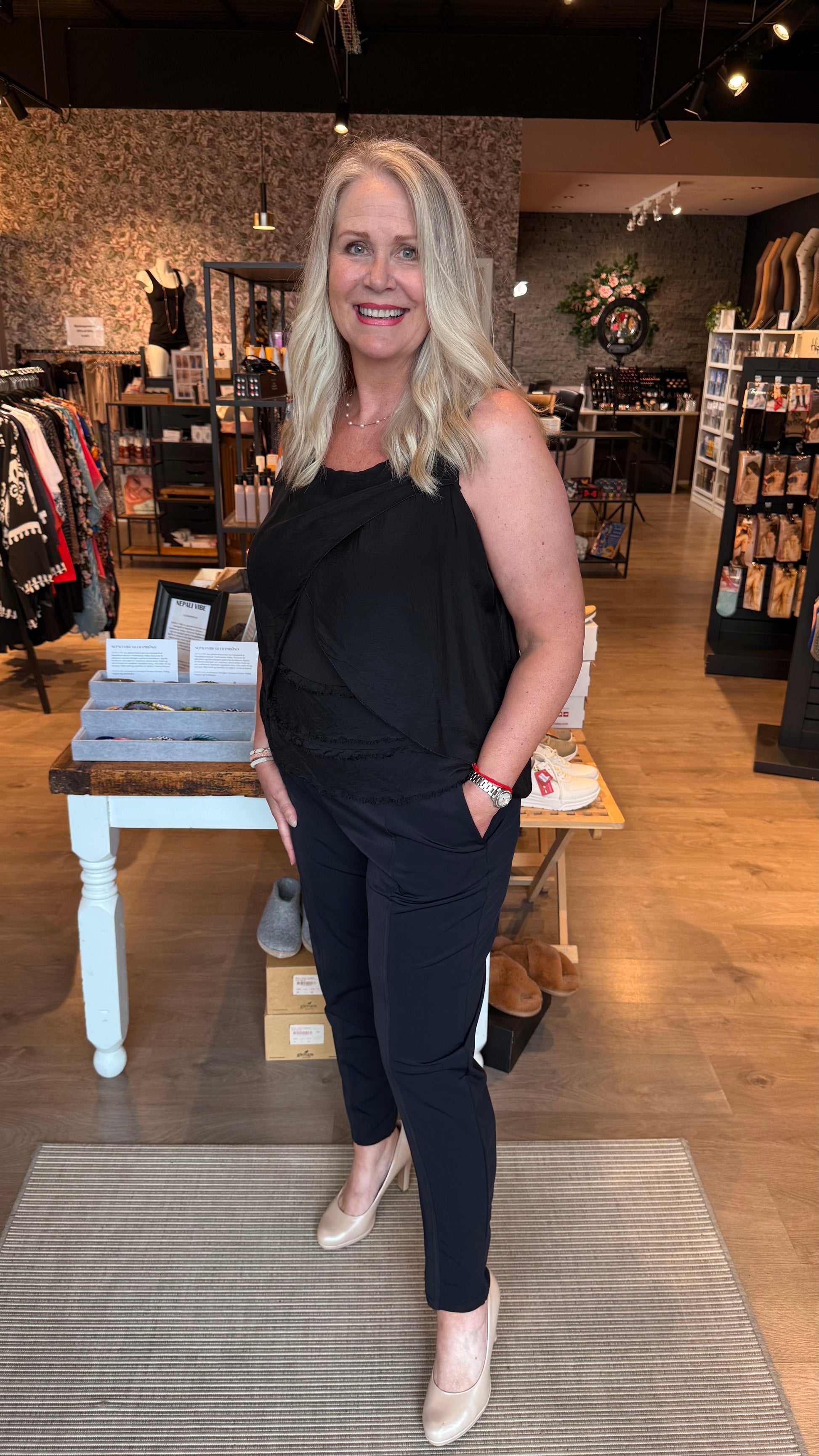 Klassískar og flottar buxur, háar í mittið og góð teygja, vasar og glans áferð sett saman með mattri áferð sem sést vel og gerir buxurnar enn klæðlegar.