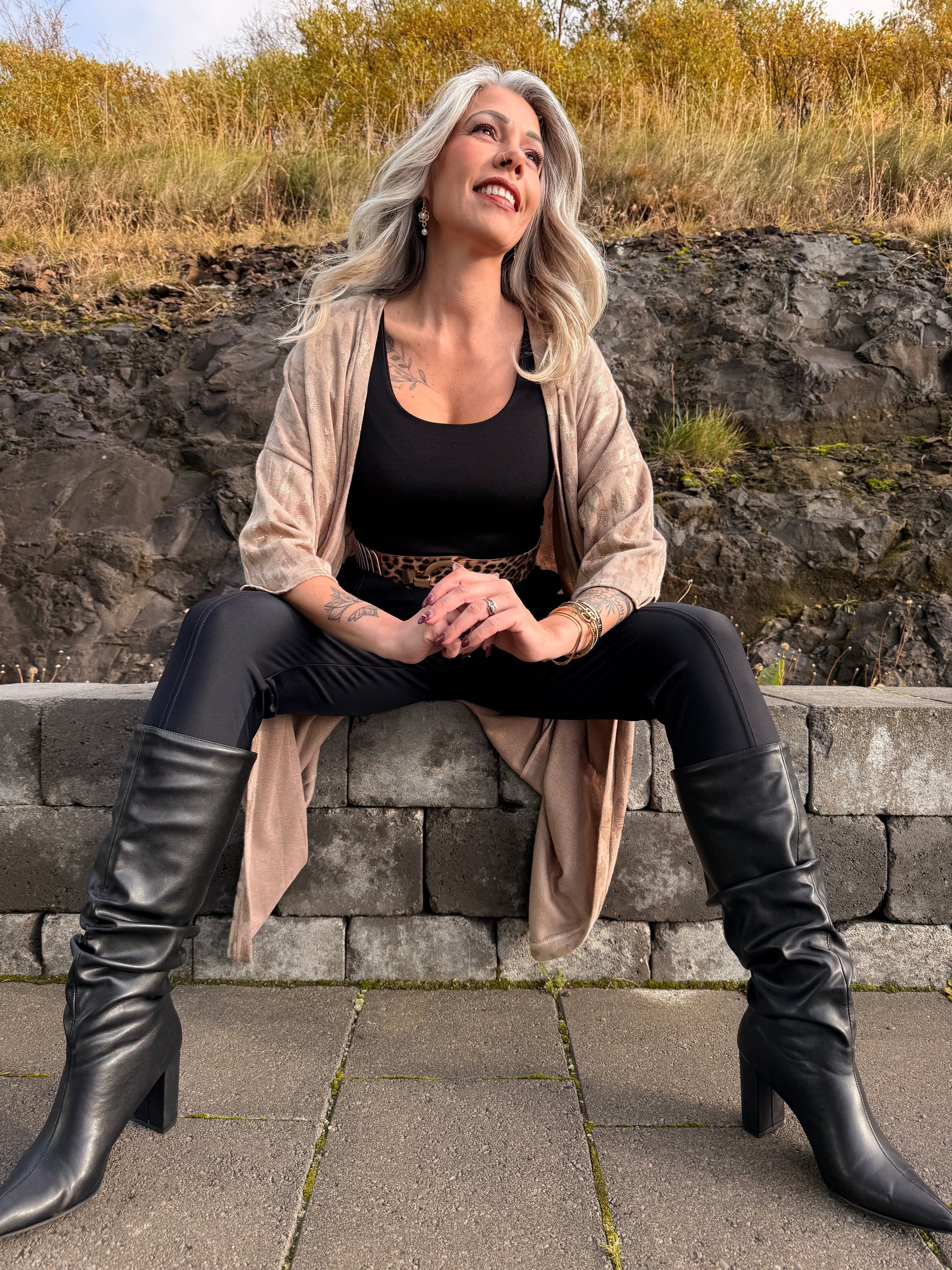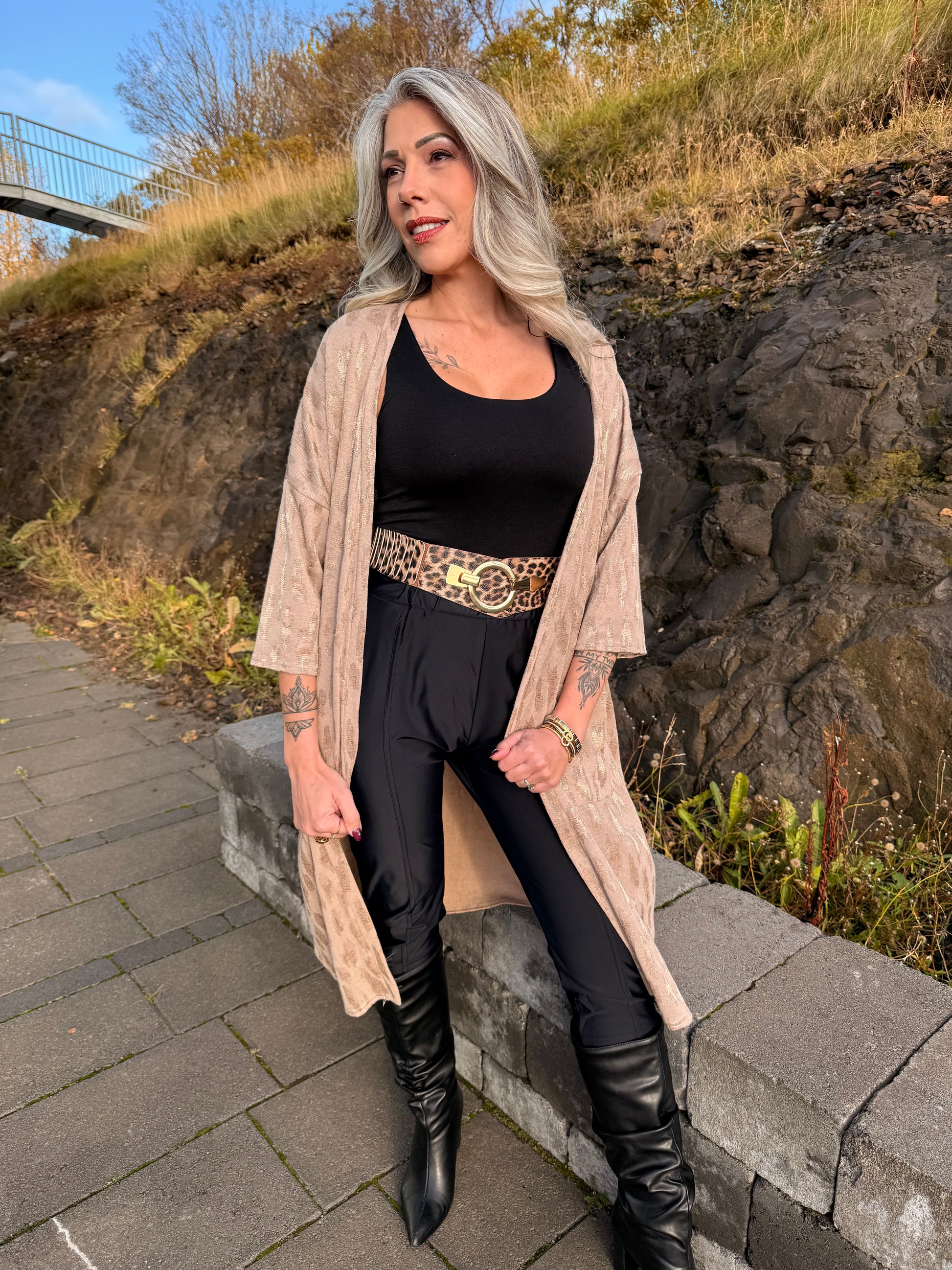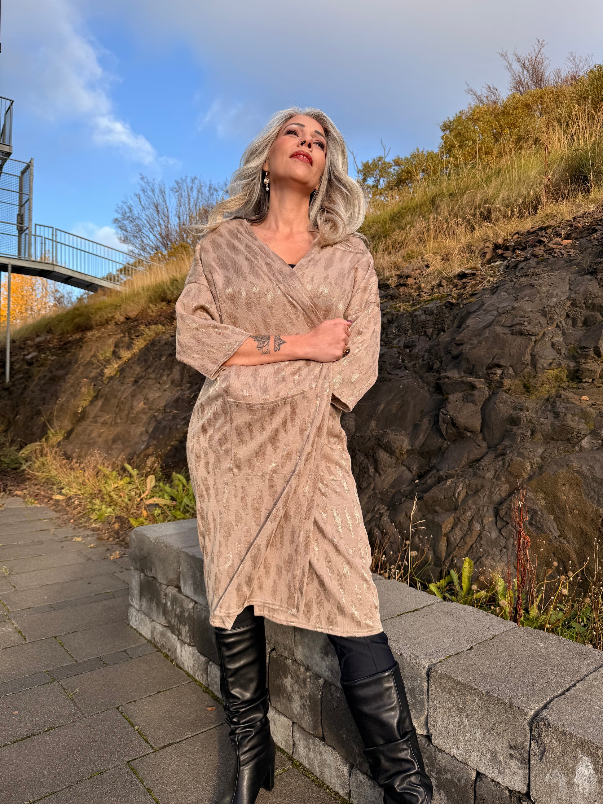 Falleg kamel lituð jakka peysa með með glansáferð í munstrinu. Kvart ermar og vasar að framan.