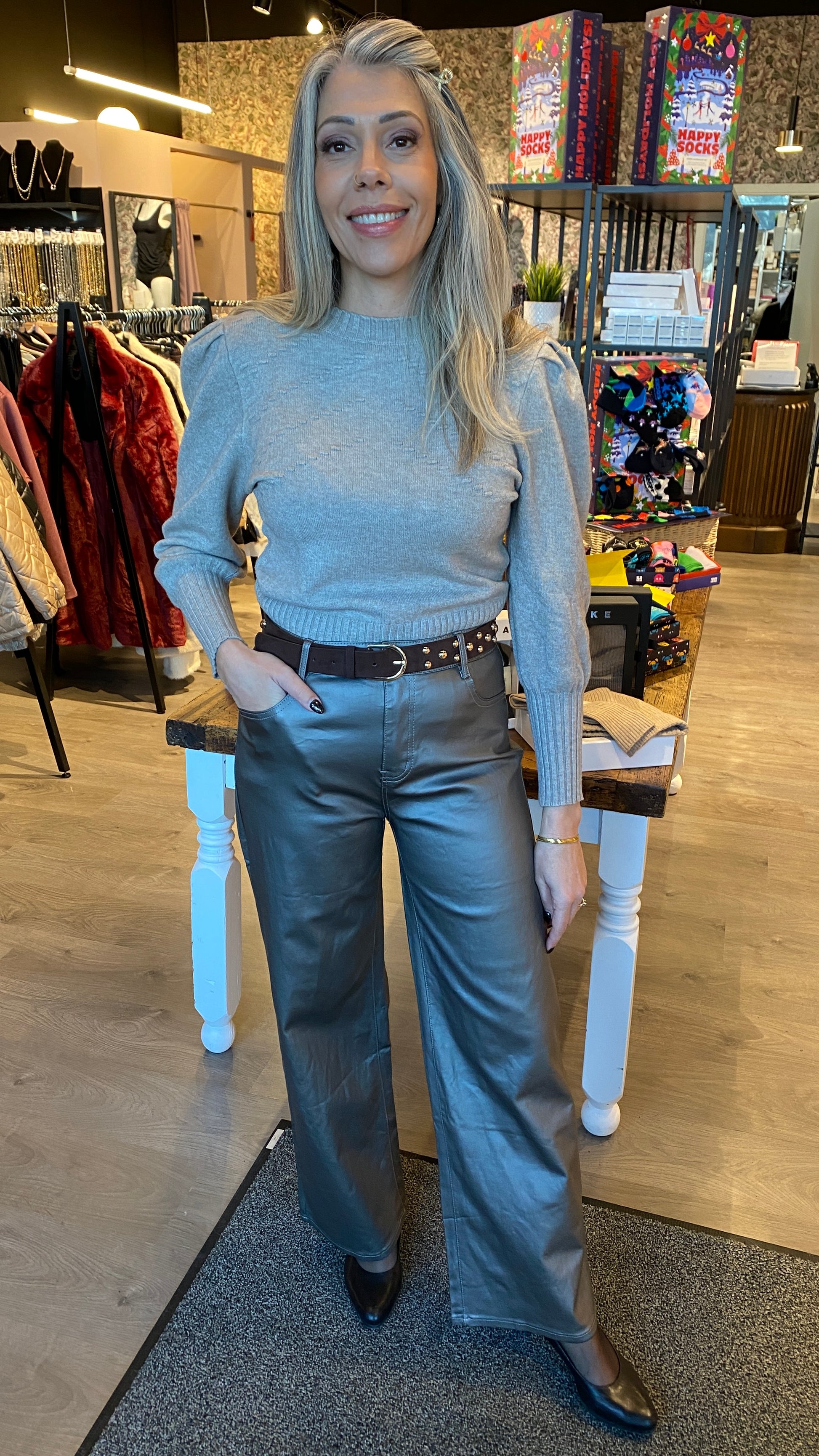 Töff pleður buxur beinar niður góð teygja í efni.