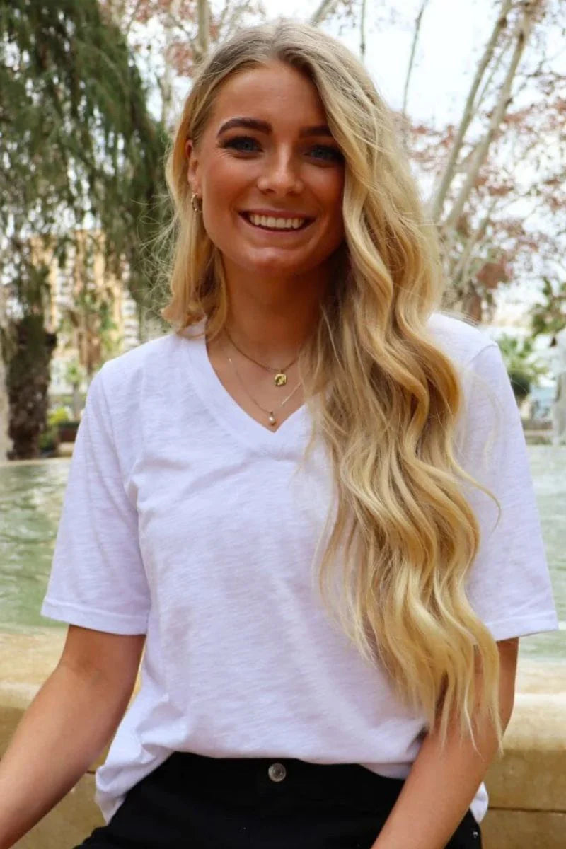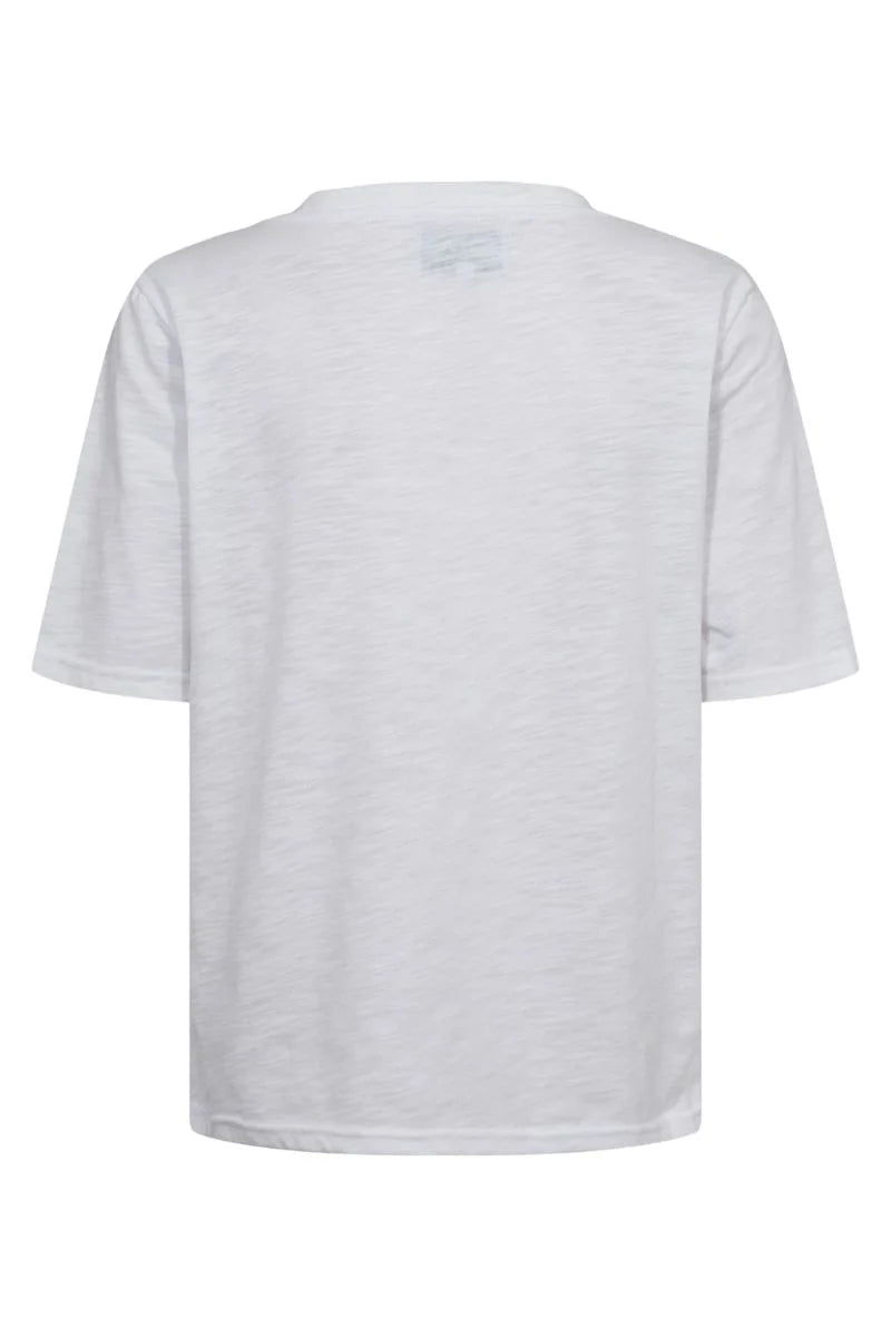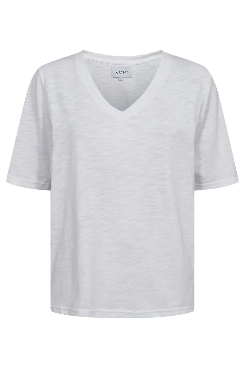 Sumarlegur hvítur stutterma bolur með V hálsmáli úr flottu efni.