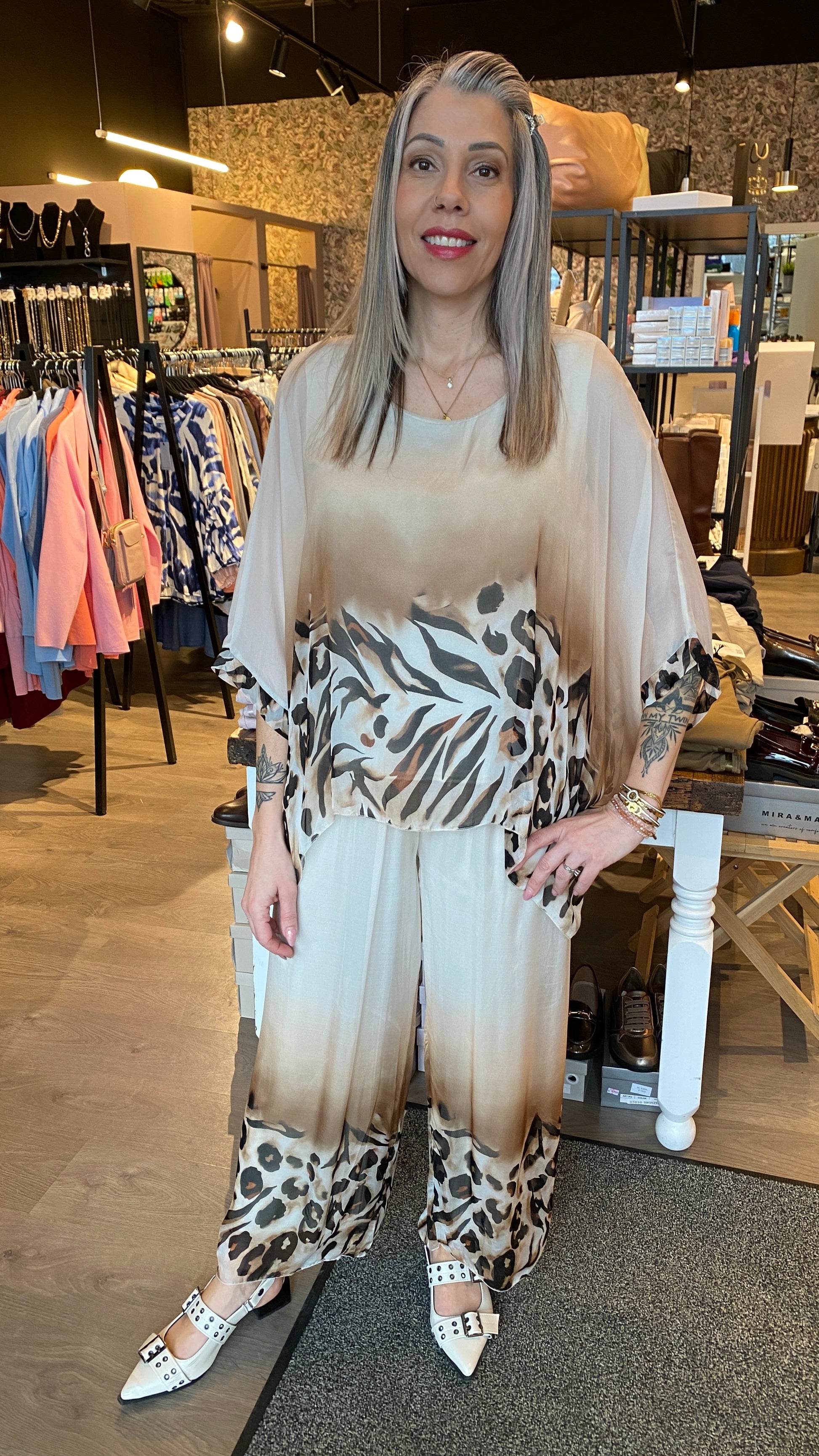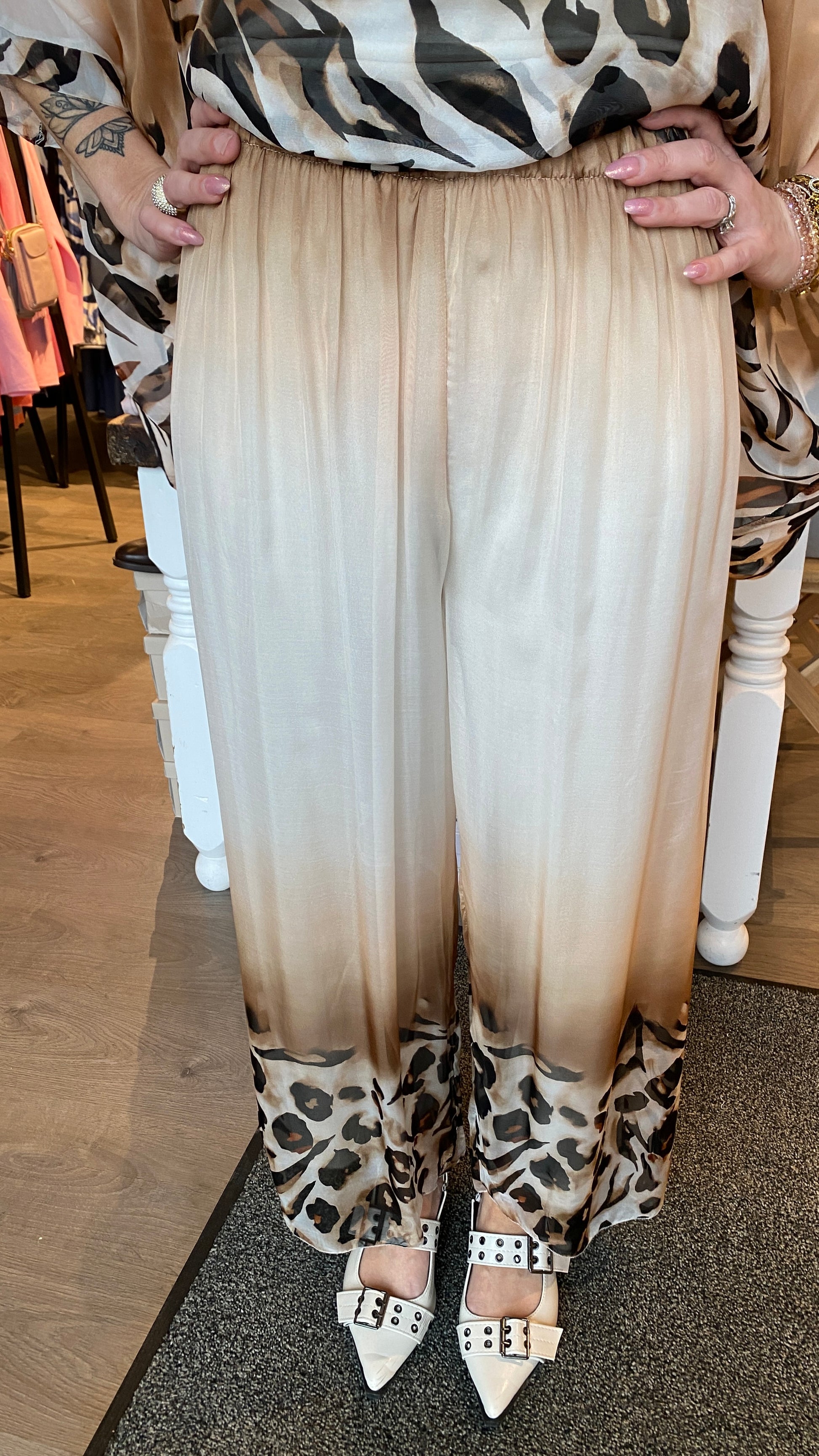 Silki buxur með teygju í mittinu og innanundir buxum. Til silkiblússa í stíl.