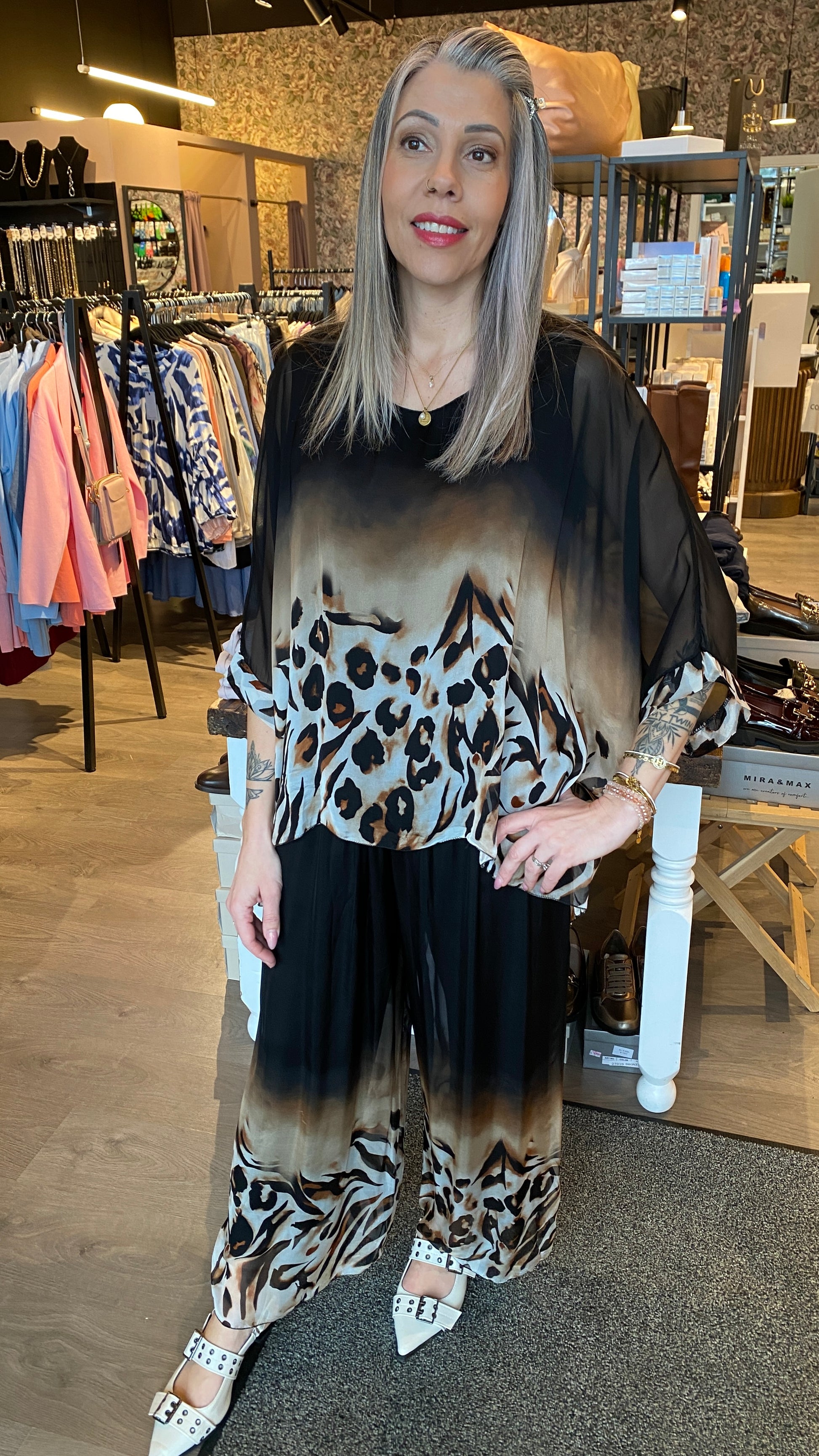 Efni: 70% Viscose, 30% Silki. Innanundir bolur: 95% Viscose 5% Teygja