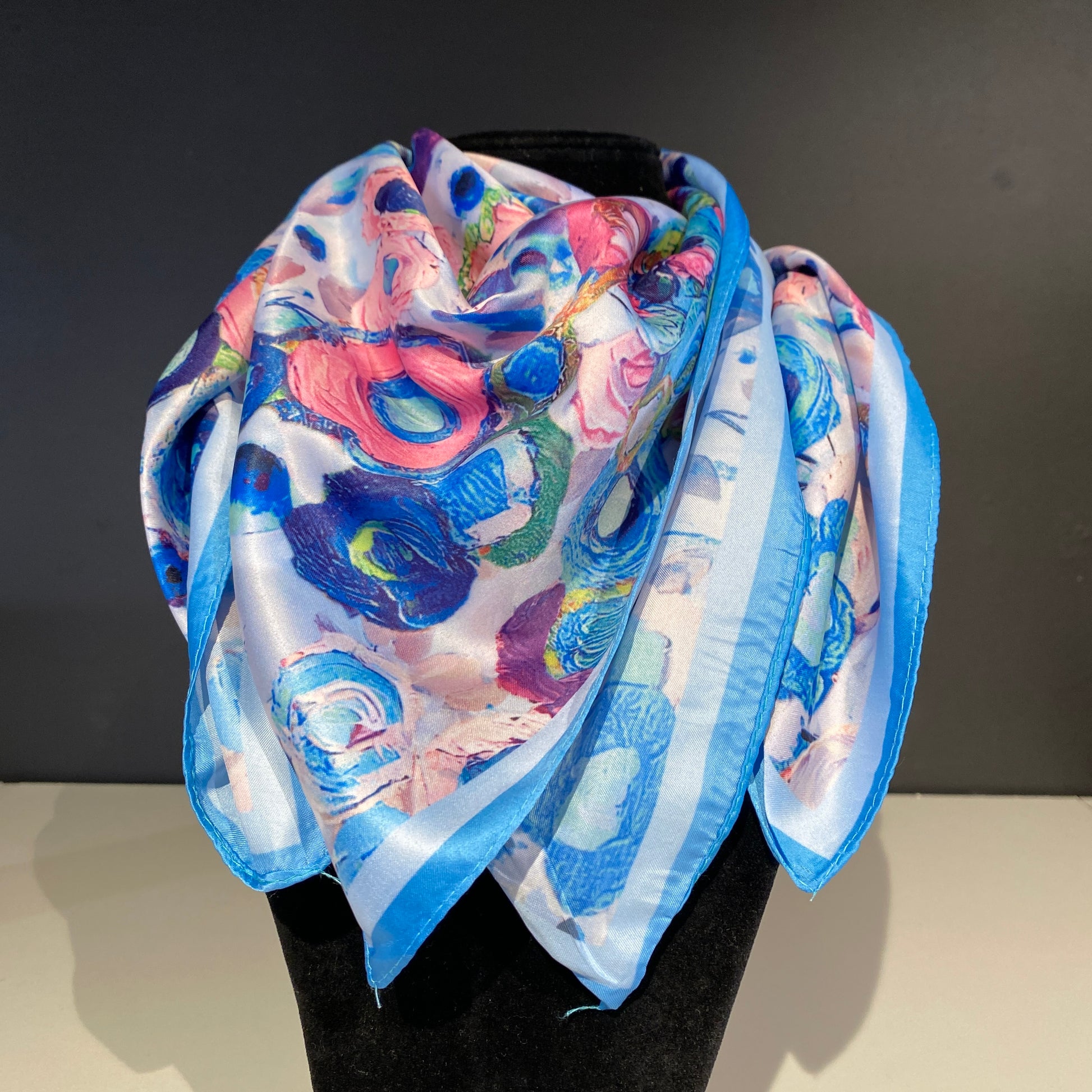 Falleg slæða í góðri stærð til að binda um hálsinn. Slæðan er bleik í aðallit með ljósbleikum, fjólubláum, grænum og gulum litum. Slæðan er með fallegu blóma munstri.