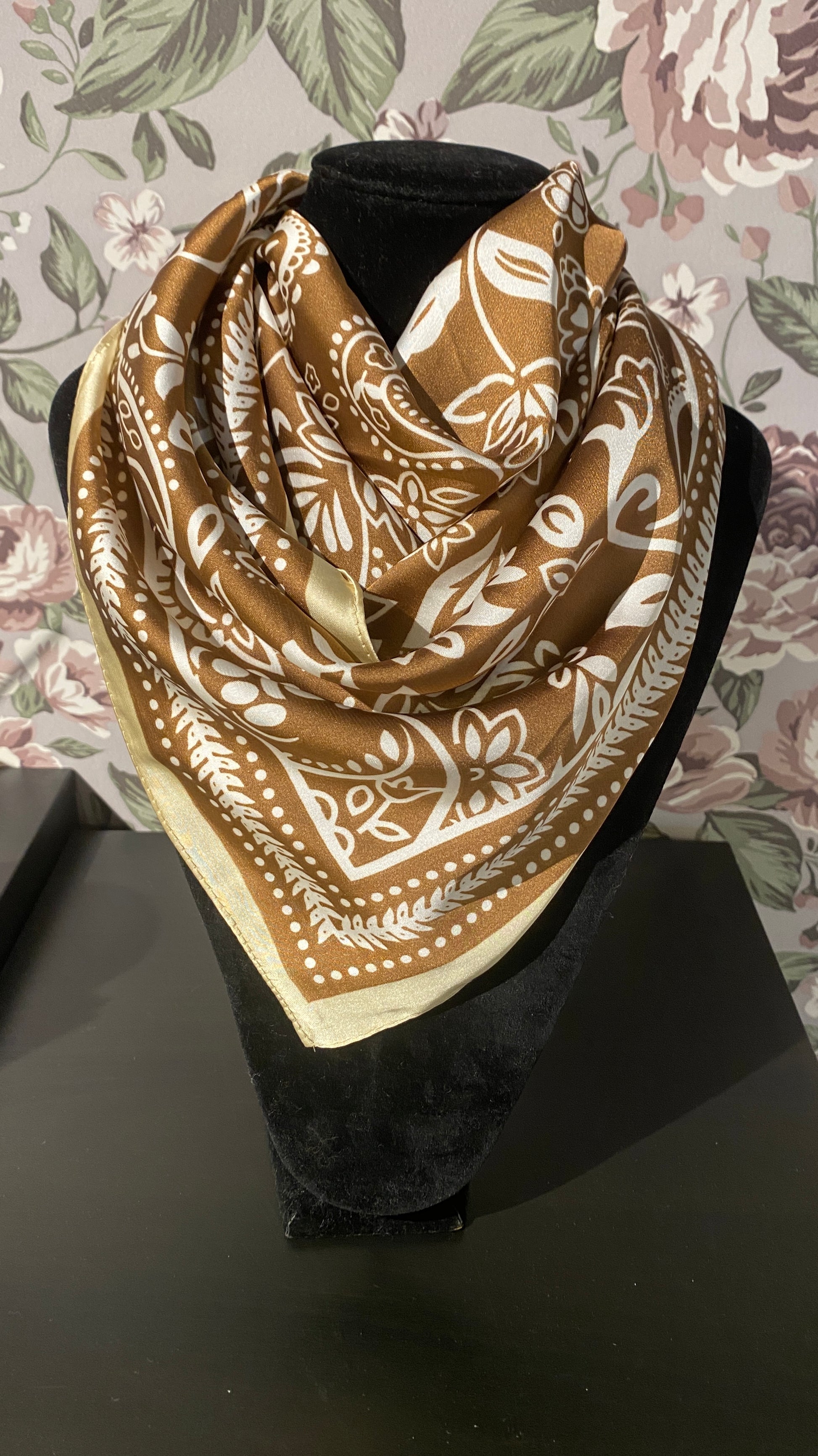 Falleg brún með hvítu munstri og beige rönd í kring. kemur í góðri stærð til að binda um hálsinn. Mjög fallegur og klæðilegur klútur.