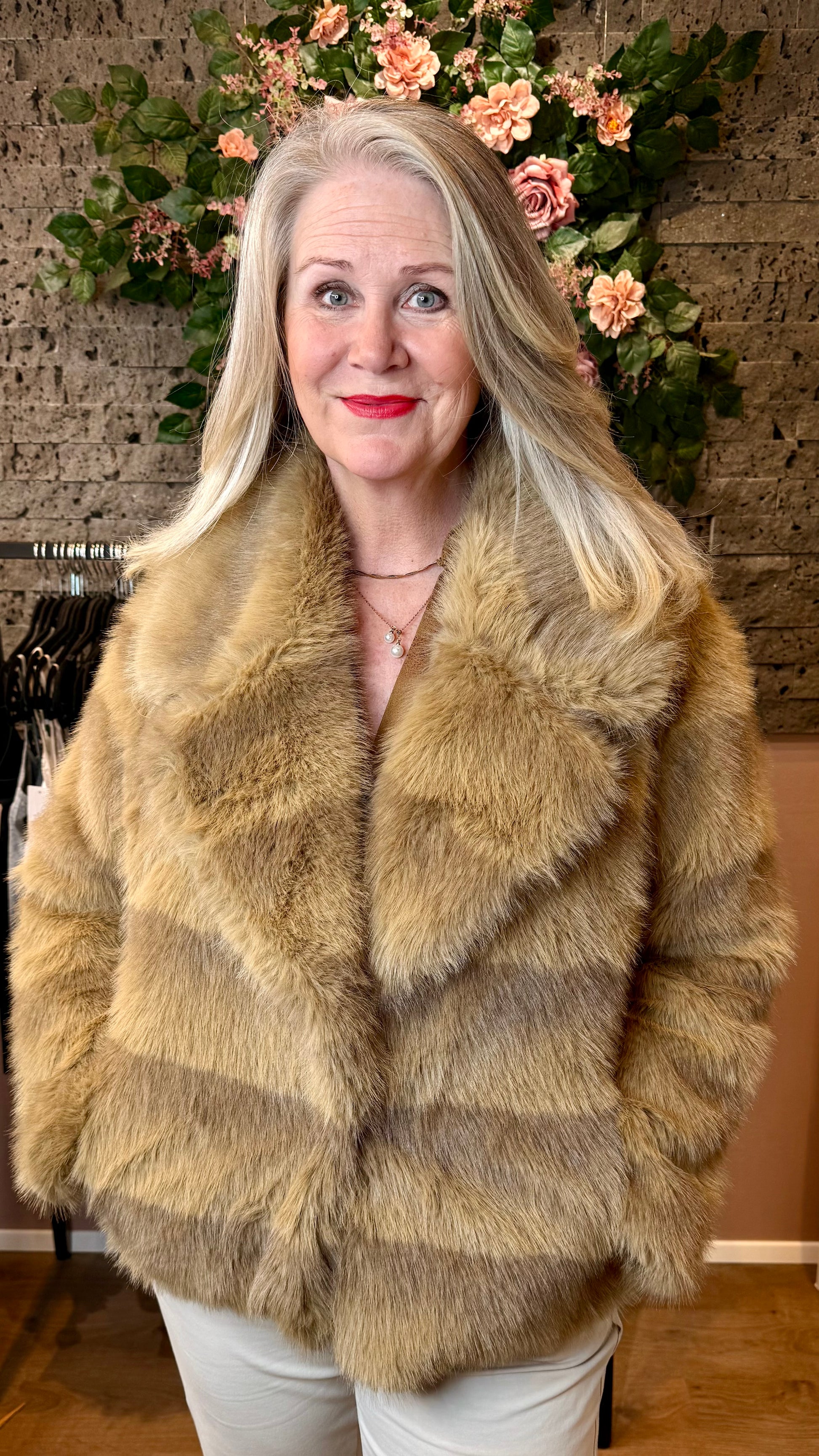 Glæsilegur og fallegur stuttur vegan pels. Fóðraðir að innan. Hneptur með tveimur tölum að framan og tveir vasar.