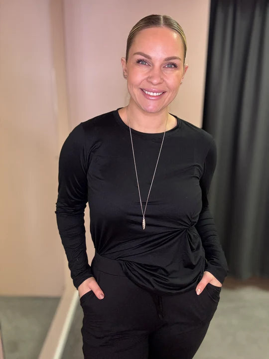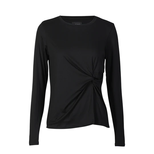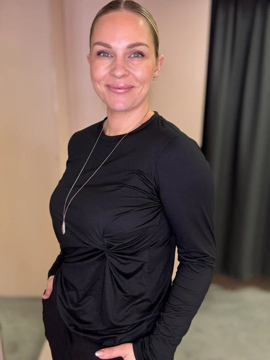 Einstaklega mjúkur og þægileg svartur bolur frá Liberté úr Alma línunni. Bolurinn er tekinn saman á hlið í einskonar hnút sem kemur virkilega vel út, smart snið. Það eru einnig til svartar buxur beinar niður í stíl.