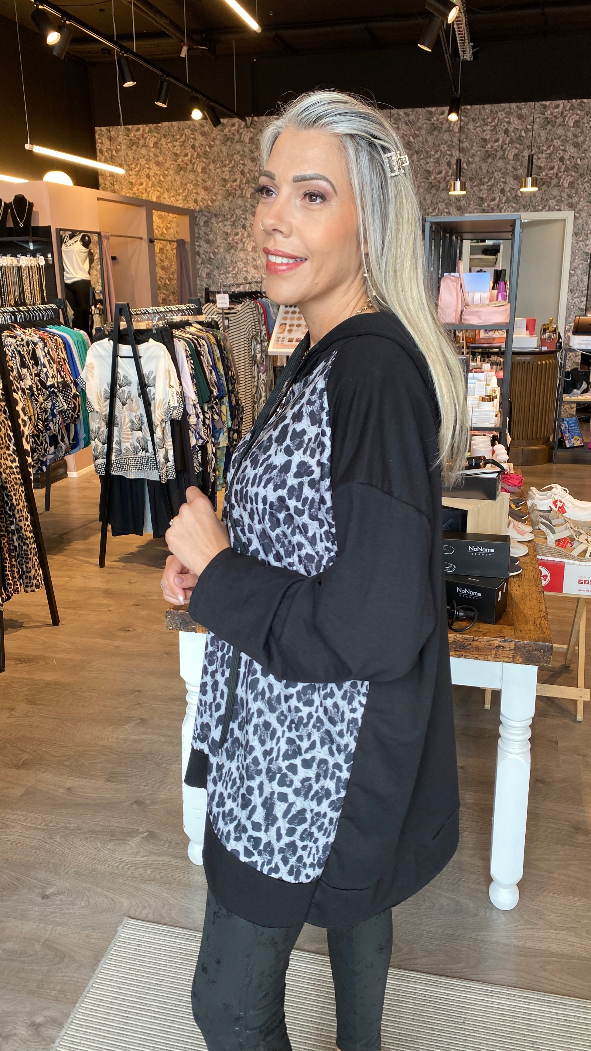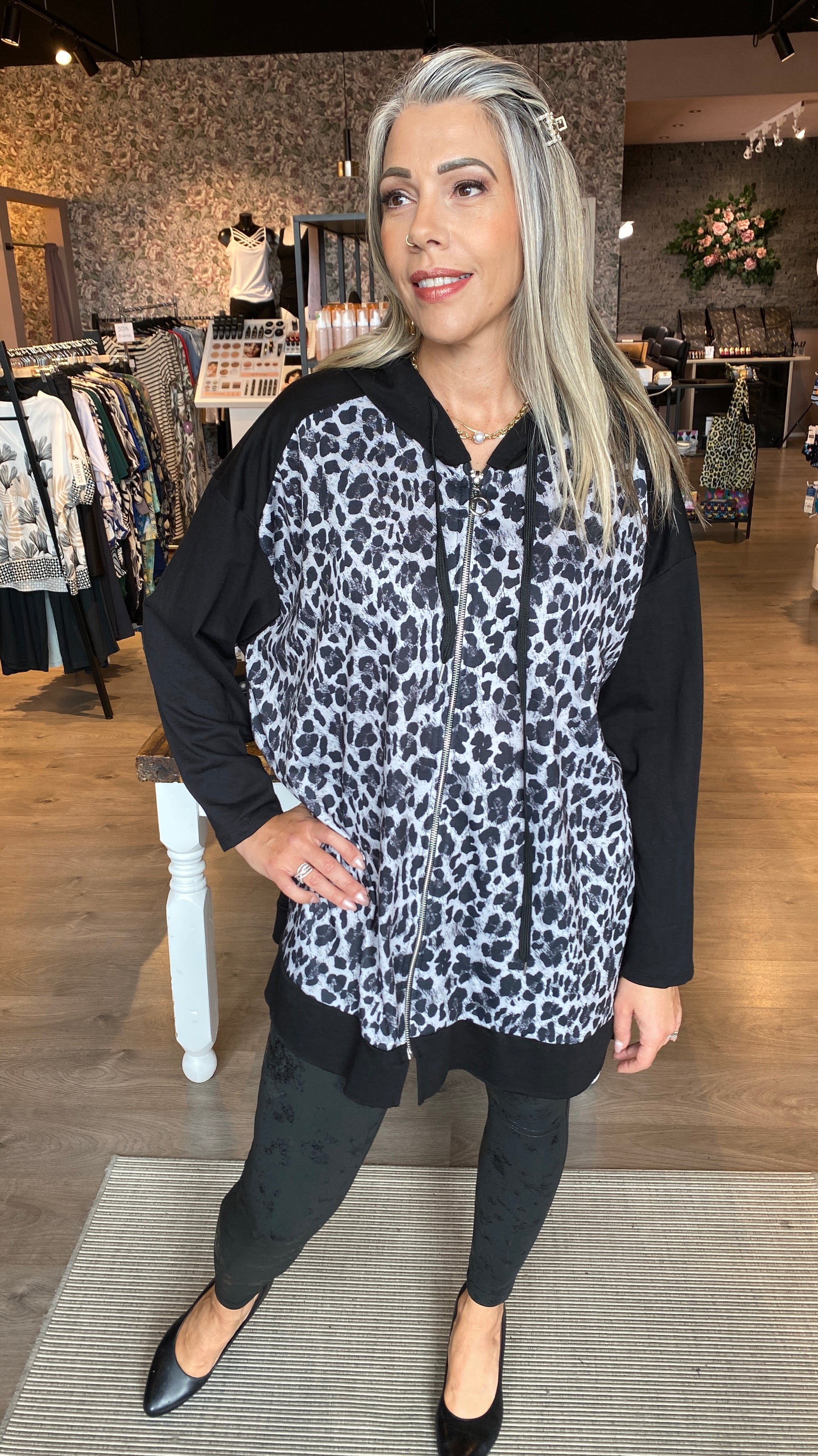 Léttur jakki með rennilás og hettu. Svartur með ljósu og svörtu dýramunstri að framan.