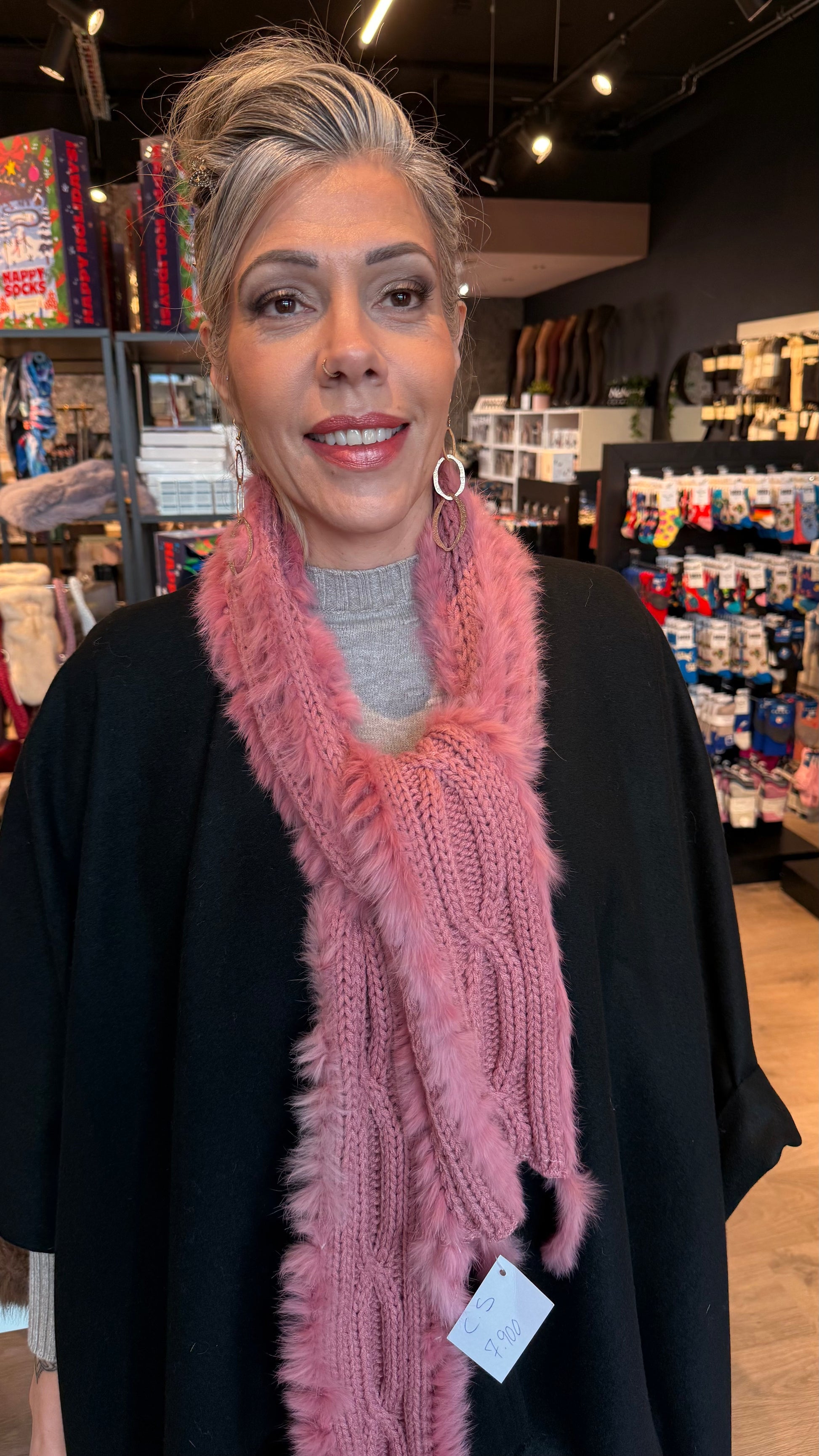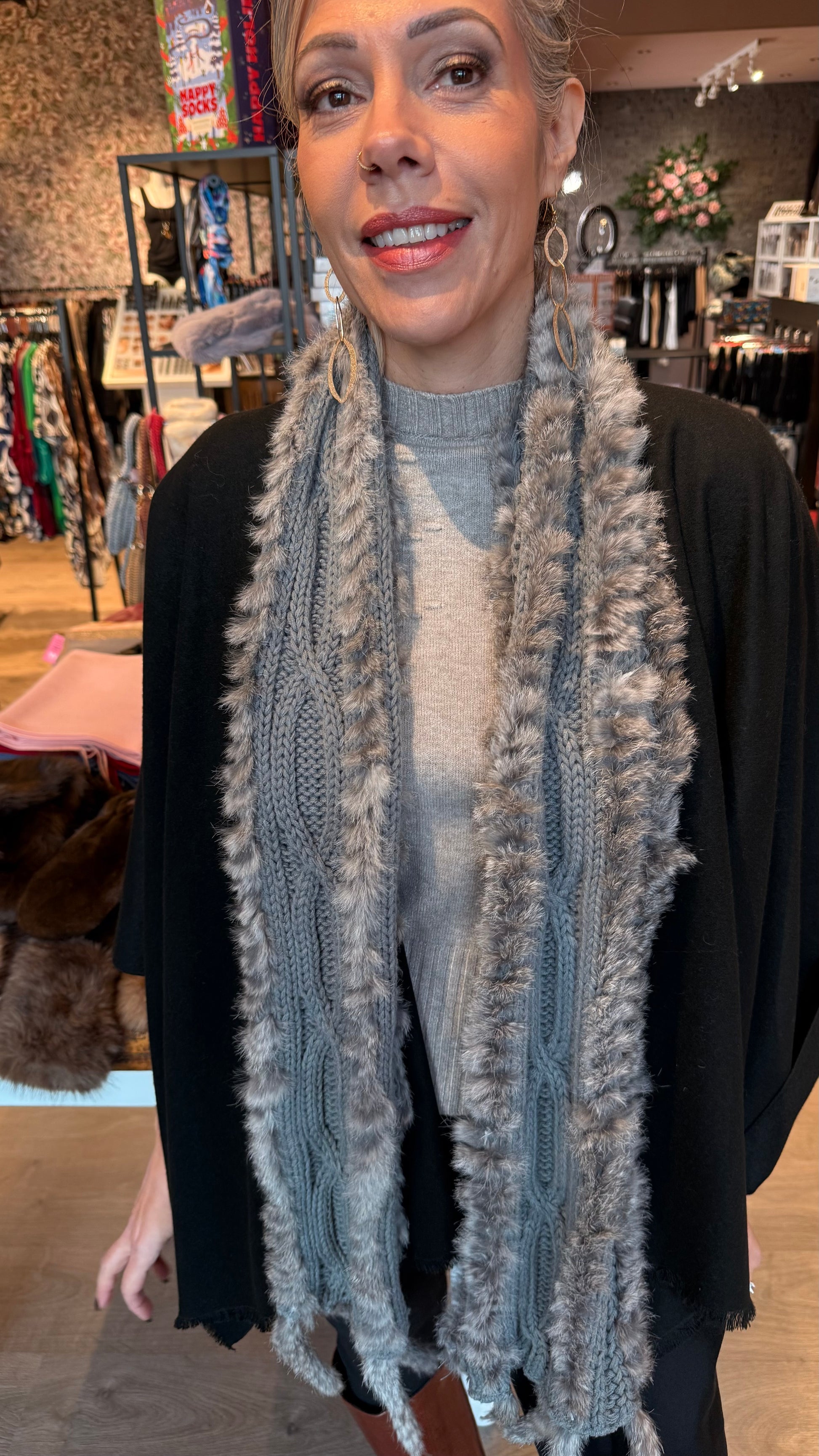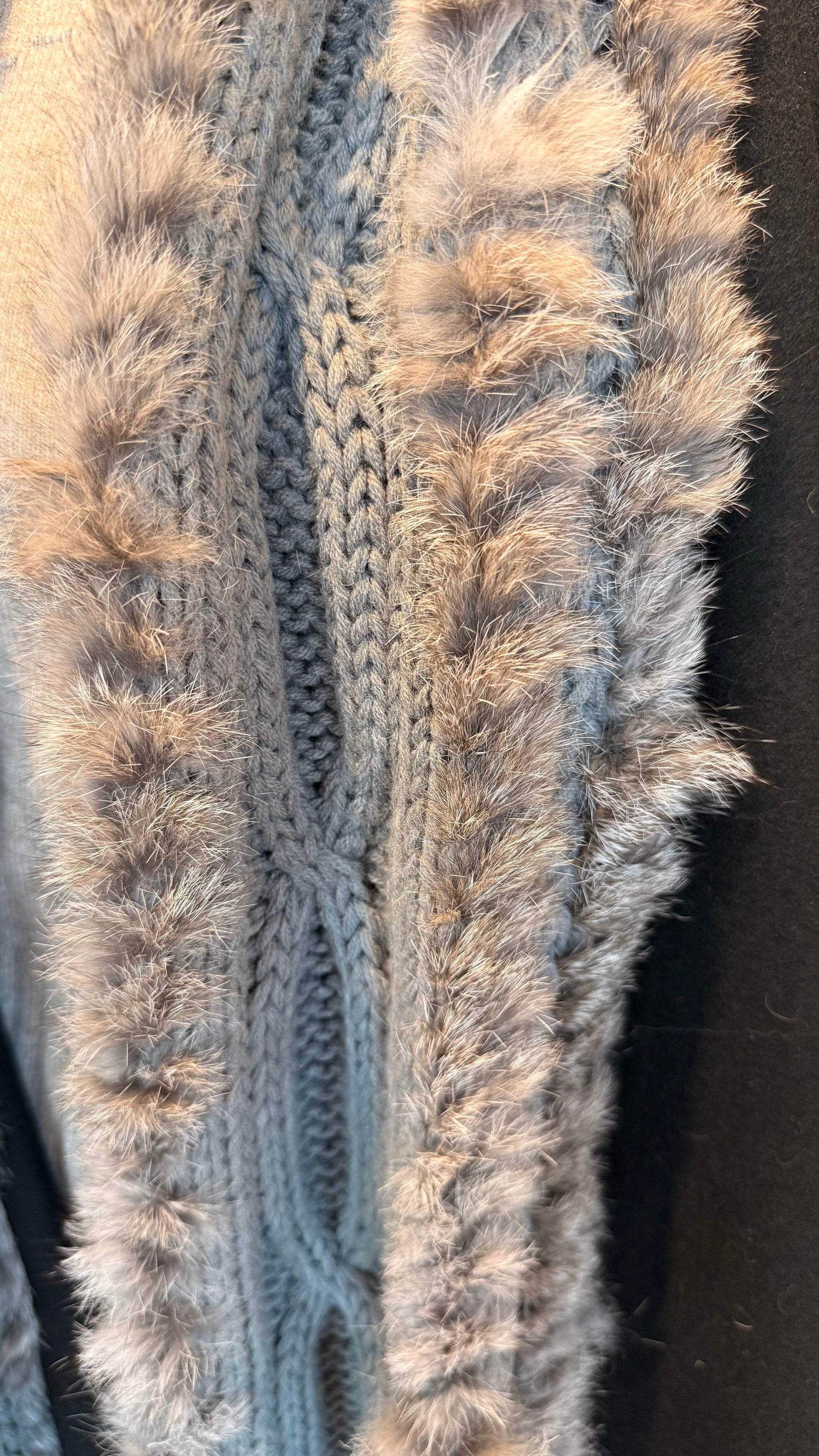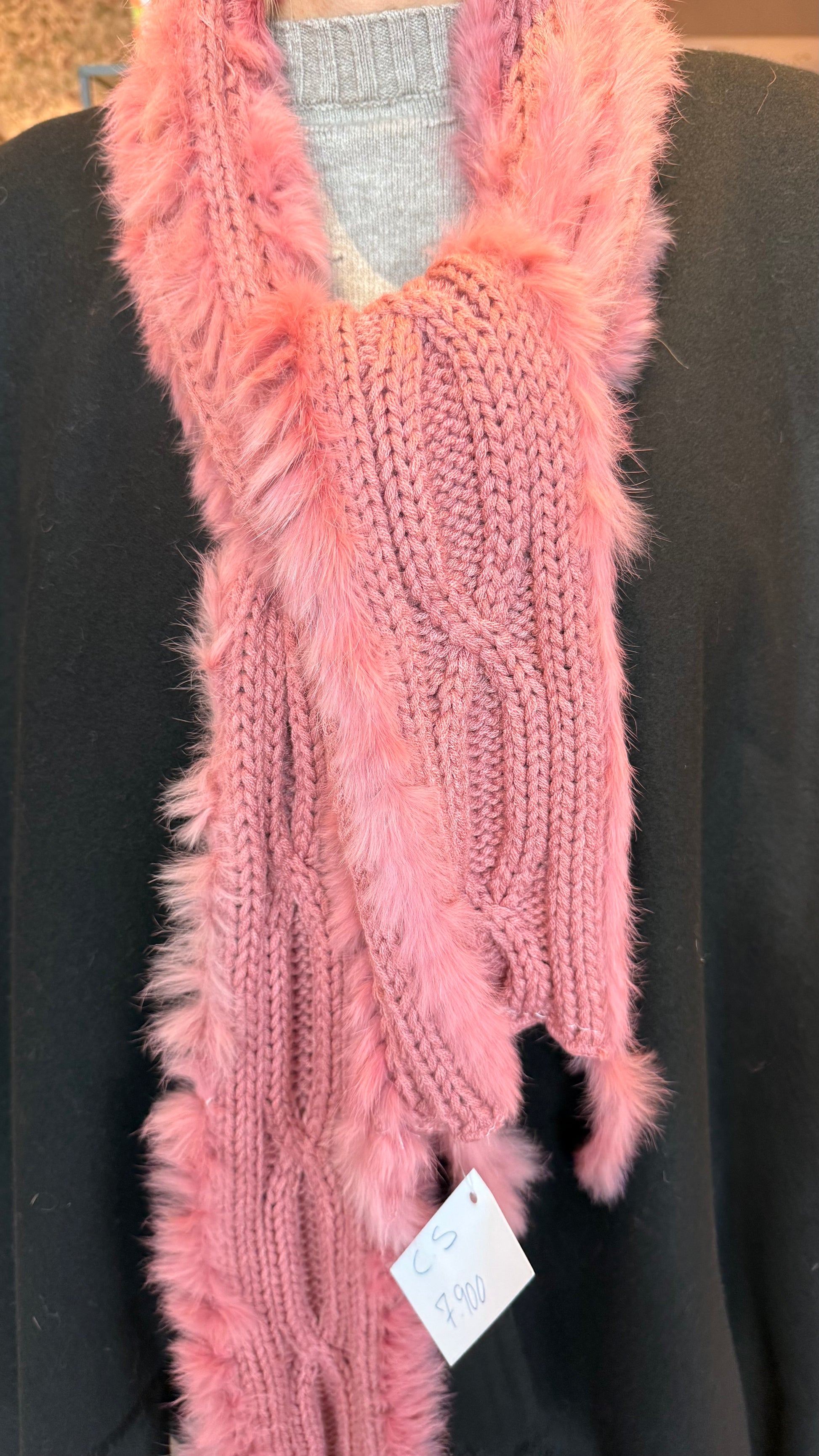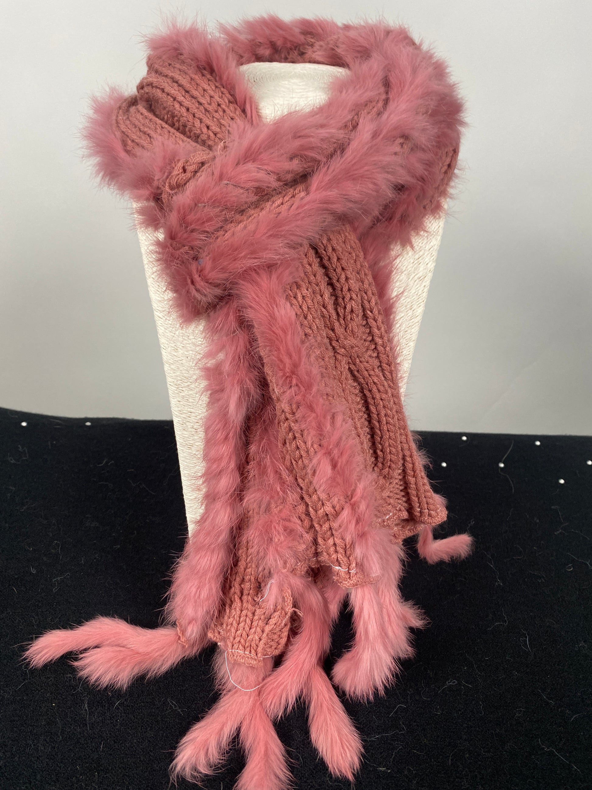 Efni: 100% acryl í treflinum og feldur; poil de lapin.