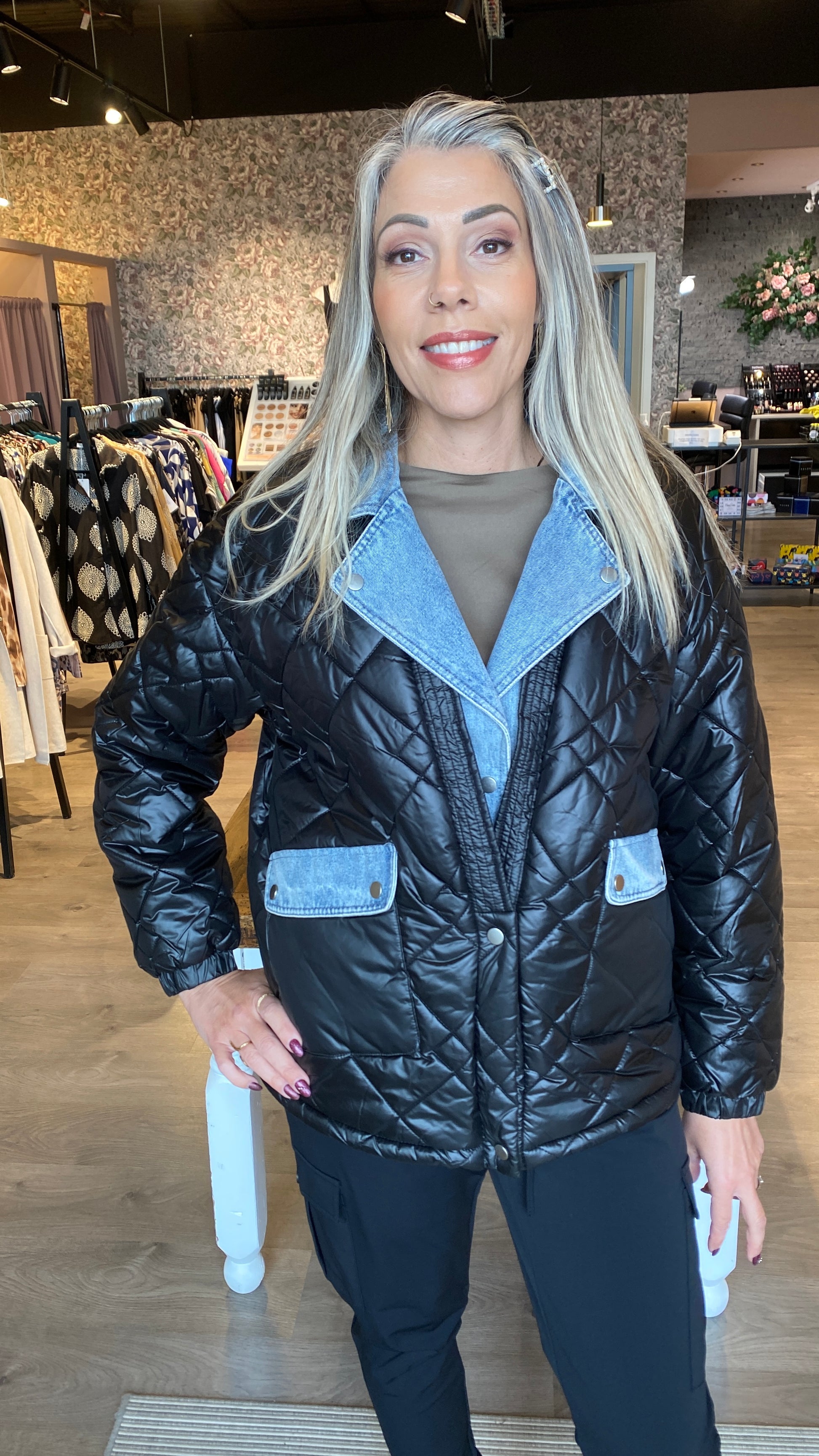 Mjög töff vatteraður léttur jakki með kraga úr gallaefni. Jakkinn lokast með smellum, vasar að framan. Fóðraður að innan.