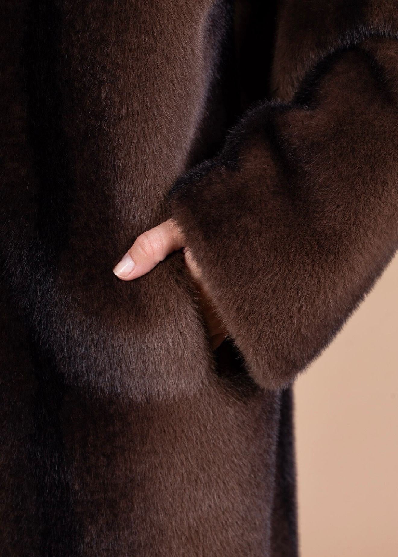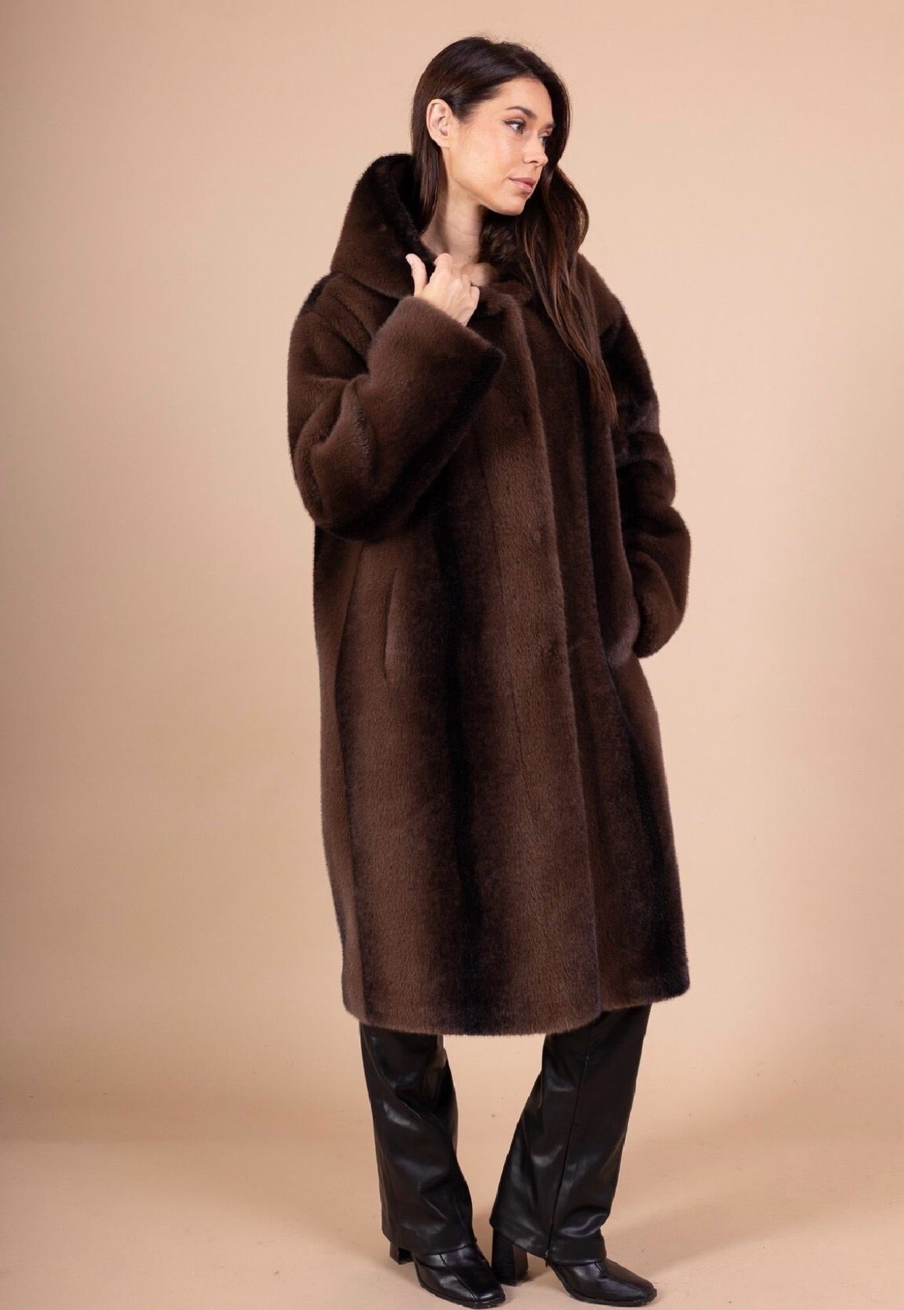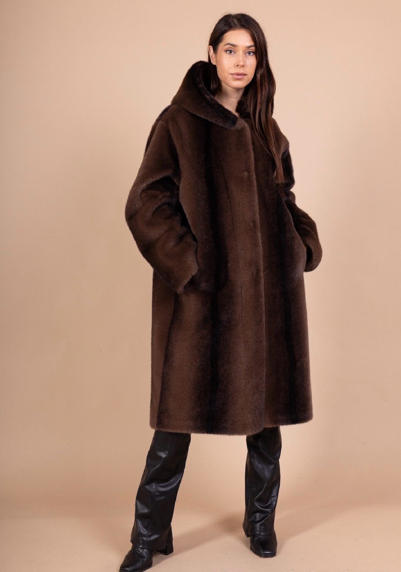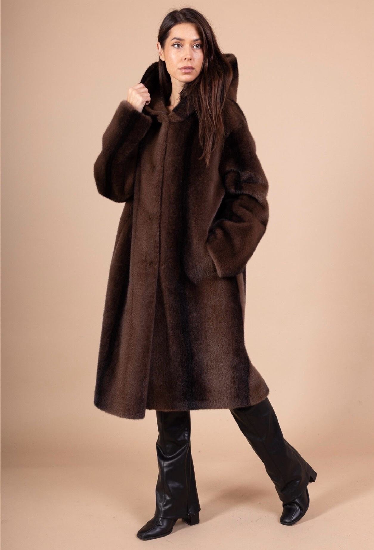 Gæða mjúkur vegan pels. Pelsinn er smelltur saman að framan og með tveim vösum og hettu.