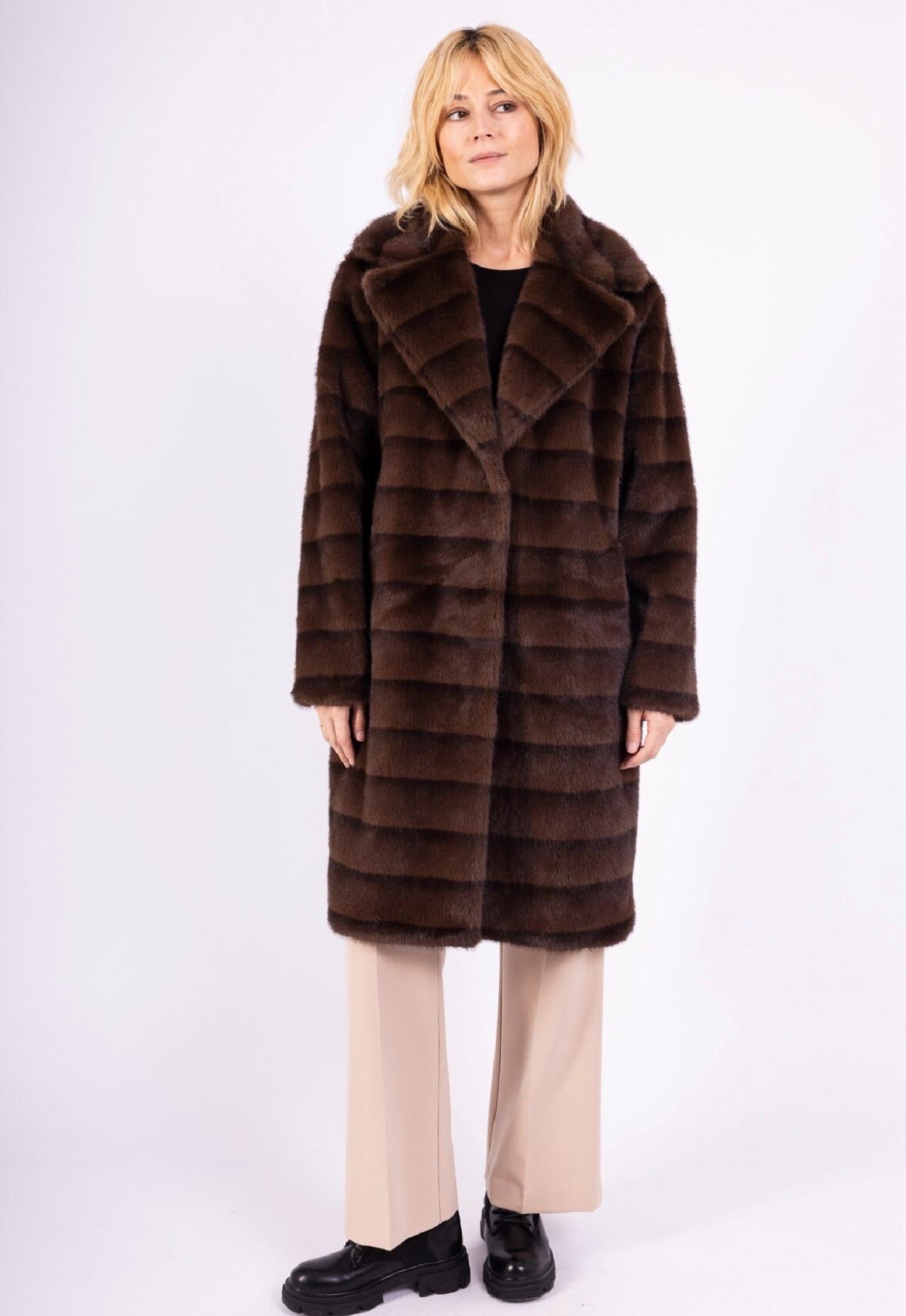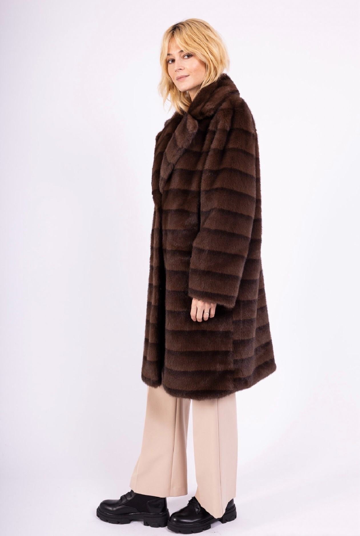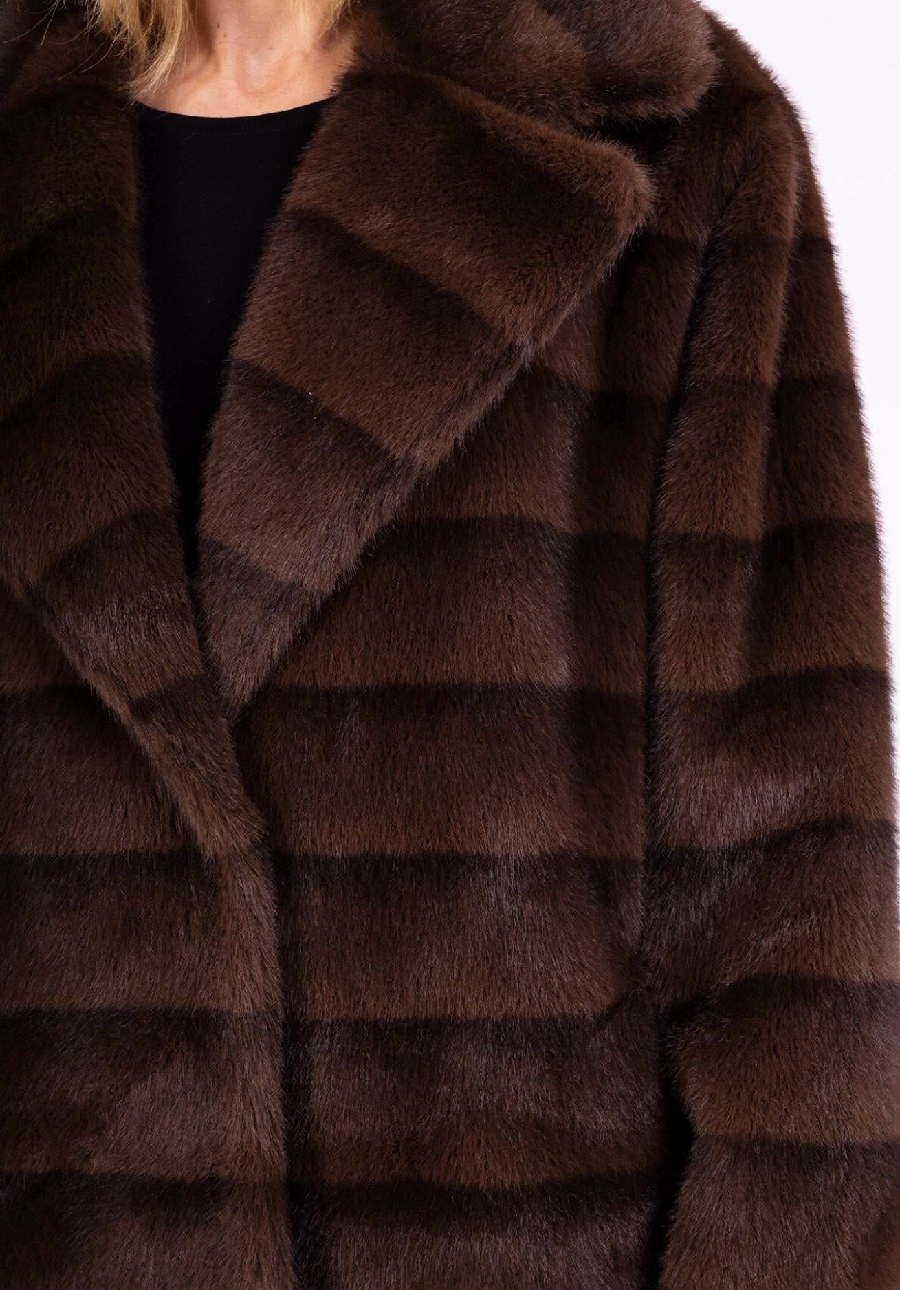 Gæða mjúkur vegan pels. Pelsinn er smelltur saman að framan og með tveim vösum.