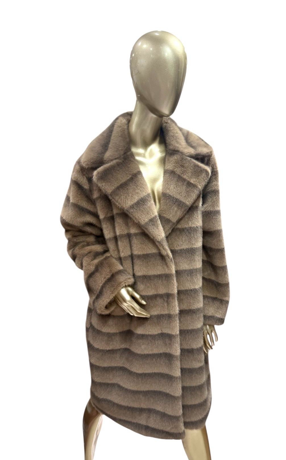 Gæða mjúkur vegan pels. Pelsinn er smelltur saman að framan og með tveim vösum.