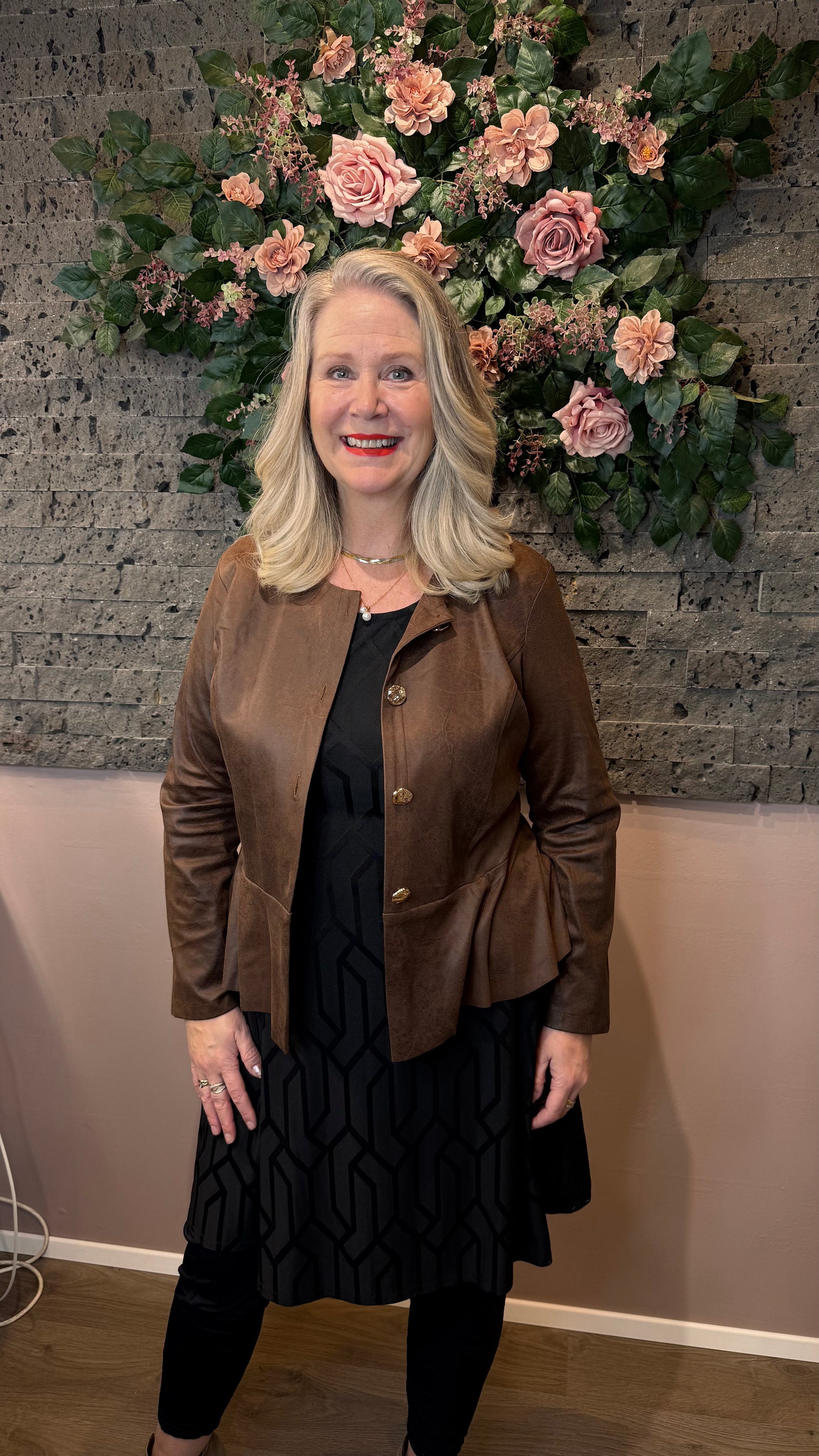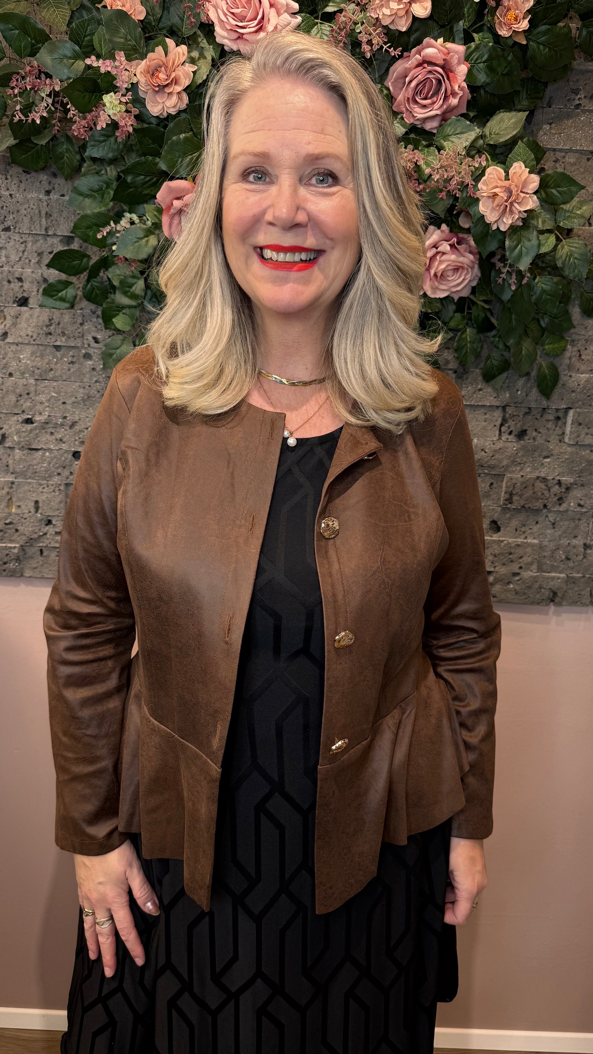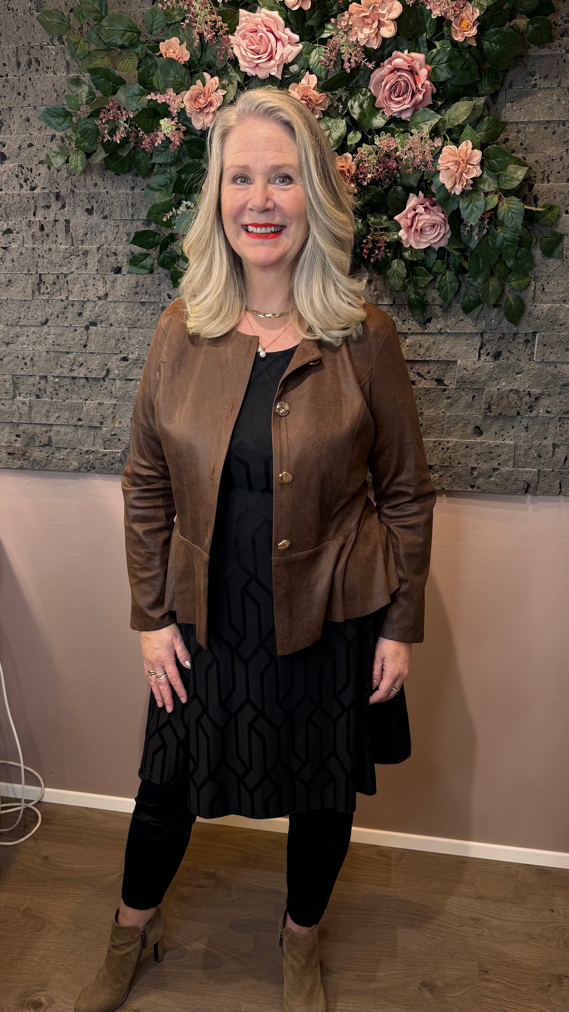 Sparilegur og fallegur jakki með gylltum tölum úr vegan rúskinni. Efnið er mjúkt og smá teygja í efninu.